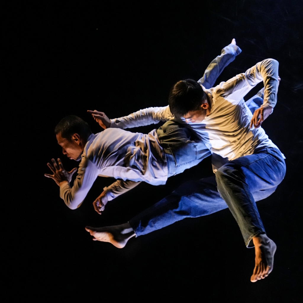 台上出現一句書毅的話:「我想,我需要你的幫助。」一束頂光斜照舞台,書毅在神似阿忠的大型剪影中漫舞著,也恰好映照出《想想別人》的末句「我希望自己是黑暗中的蠟燭。」當書毅自陳自己才剛學會走路,阿忠卻已踏入平日身體訓練的公園——前輩之所以被前輩,究竟阿忠到此、阿忠在此,是周書毅的共同創作夥伴?作為編舞家的舞者?身體導師?還是生涯焦慮的精神救贖?