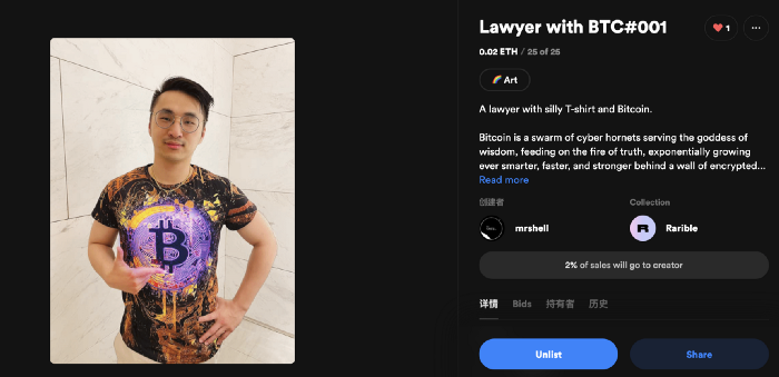 世界首支律師諮詢NFT收藏品:Lawyer with BTC#001,甫經公開即被搶購一空,#002 Fantasy正式於Rarible及opensea公開。