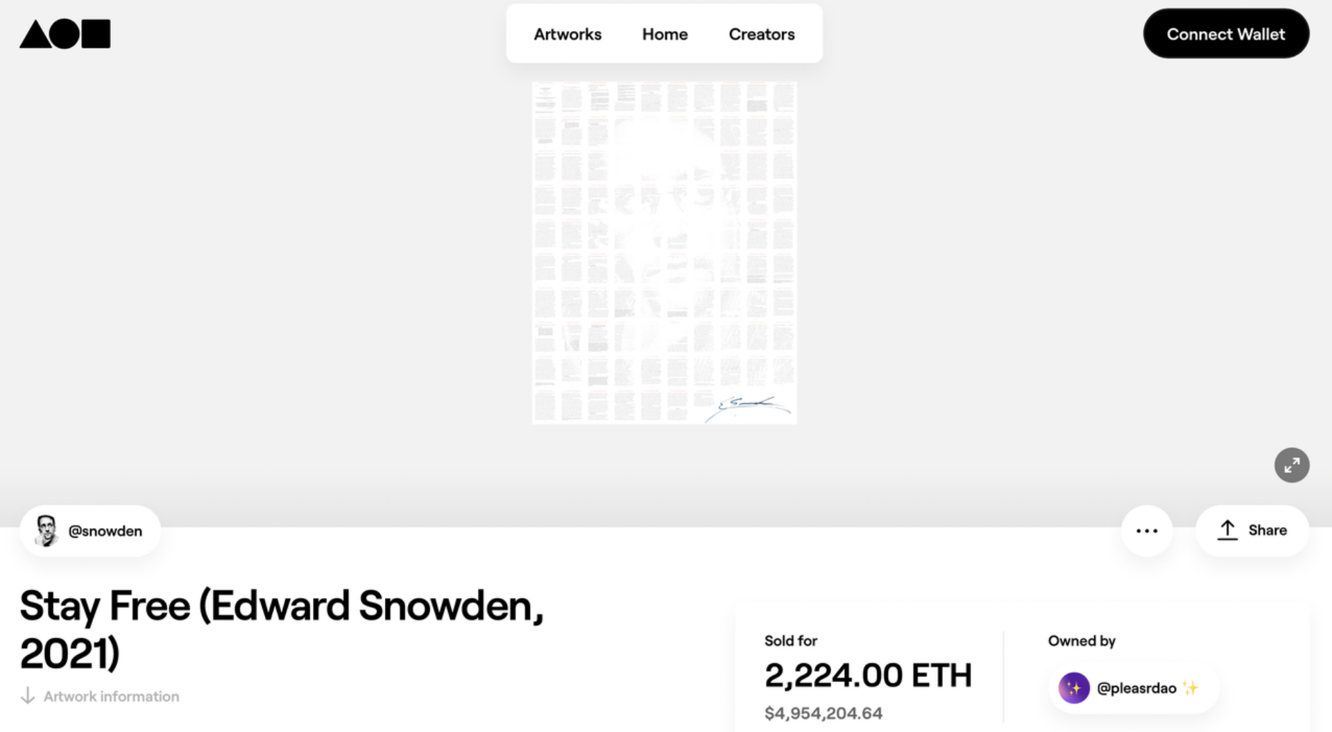 這是一場由專業人士發起的NFT社會實驗活動,日前 PleasrDAO 才以 2,224 ETH(約 1.5 億台幣)標下「神鬼駭客」史諾登所發行的《Stay Free》作品,成為史上第 4 高價的 NFT。