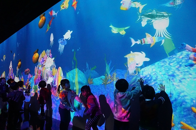 此次,teamLab更首次在《塗鴉大自然》一作中,跳脫過往平面的呈現方式,改以四面立體環繞場景的型態打造虛擬自然生態。這件作品觀眾必須先在特定紙上幫生物著色,而後透過機器掃描,紙上生物即能投影在展區中,成為自然生態中的一員,空間中觀眾能同時更與這些投影的自然生物互動。《遠古神靈故事》則選擇以中國象形文字為背景,每個象形文字透過觸摸會轉化為自然物象,物象與物象間相互影響並連結成故事,例如鳥會停留在樹木上、羊看到狗會驚慌逃走等,每個文字被召喚出各自所蘊含的意象,相互互動創造新世界,而當多人與文字互動時,作品幾乎每秒都在變化,令人期待下一秒的故事呈現。