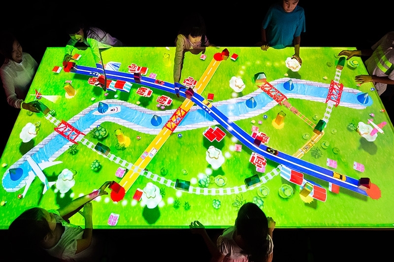 《串聯吧!積木小鎮》中,參與者透過積木擺放,創造虛擬城鎮。圖|teamLab