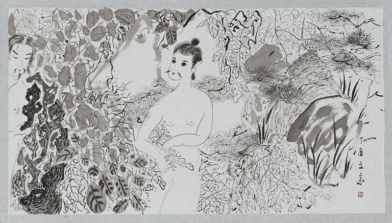 印象中,廖文豪的一筆一墨是斤斤計較又出神入化的。從2011年正式發表「山水人形」伊始,然後2013年「有意無意」個展,內容盡是「山水與人的結合」。就他回顧,這是第一階段人境一體的共生狀態。雖然筆墨、構圖、形式拘謹,圖像寓意凝重且學院派,但當時所繪是一個自給自足、不需向外探求,宛如待在羊水內的胎兒,對世界即便抱持些微好奇,但現實仍與自身無關。這一強調山石擬人化,或說「從人的軀體找山石」、「從山石找身體感」的創作觀,確實讓他一鳴驚人,作品獲得高詢問度。不過,畢竟年輕,無論創作或圈內環境,還是待人處事的生存問題,只能不斷摸索。精神物質相對惶恐不安,有所渴望,總看著他方,手腳不自在,心也不自由。再看看當時畫作內容,把想藉圖像說的話全放在了畫面中央。彷彿向世人大聲呼喊:「我在這!我在這!」而主角之外的其他,並非配角,只是裝飾。