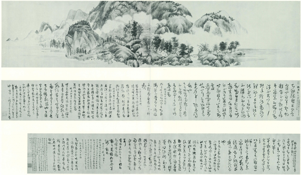王鐸的《書畫合璧卷》,便是書寫在這種材料上面。己丑年(1649)正月,王鐸剛被授命為禮部尚書官禮部左侍郎。此時年近花甲的王大學士仍臨寫不輟,自言「一日臨帖,一日應請索,以此相間,終身不易」。某日由於天晴,積雨數月的鬱悶心情一掃而空,便乘興小試吳興新筆,囑三弟王鑨磨墨寫此《書畫合璧卷》,積三日乃成。細觀卷中山水,多濕筆暈染,雲煙繚繞。山路上還藏有一行成傘的旅人,王鐸自己與三弟或許也化身其中,往山寺前進。各式建築藏於山頭,群山之結體架構雖較鬆散,點景倒也豐富清楚,最後以遠山水景作結。整段全景式山水居於長卷中段,夾於書間,尺幅雖不寬綽卻五臟俱全。以王鐸寫字之迅速,這段繪畫應是三日積累筆墨的重頭戲,也呼應了他在題跋中所言畫非易事,應當慎重的態度。末段跋語提及,此卷為王鐸同鄉老友張縉彥之子索書而成,故「偶倣宋數家意畫」。王鐸畫學北宗,與其家藏、寓目有關;他所題跋的名蹟有關仝《秋山晚翠》、董源《洞天山堂》、傳巨然《秋山圖》等,再加上三弟與其他親友的收藏,不容小覷。總體而言,王鐸對五代、北宋初期的畫史多有留意,筆下山水也多宗荊關,丘壑偉峻,不多皴擦,以暈染作氣。