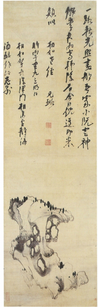 另外一件熠熠生光的作品,為倪元璐的《文石圖軸》。與同年進士王鐸、黃道周號稱明末三株樹,倪元璐書風在二王之外尋找出路。倪書以行草見長,字勢多高聳右肩,而用筆挺勁短促,節奏明快,具有強烈的粗細變化,與黃道周相近,較有鋒棱色澤。清人秦祖永評為「靈秀神妙,行草尤極超逸」。此件立軸小品,下半部畫一生苔靈石,上半部題寫七言絕句一首,自言趁酒酣當一日米顛,畫韓陵奇石,用以贈別相如老侄。觀石上勾勒皴染,亦靈動非凡,格古清奇,一如其字,末筆補綴重墨苔點,畫龍點睛。全幅圖文相互呼應,尤其是絖本造成漲墨、澀筆遲滯等不確定因素,更助長書家個性的抒發,表現張力更加強烈。