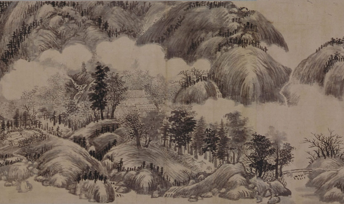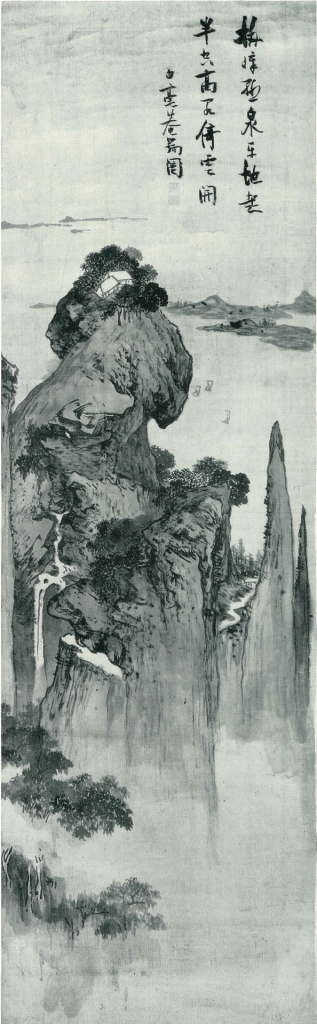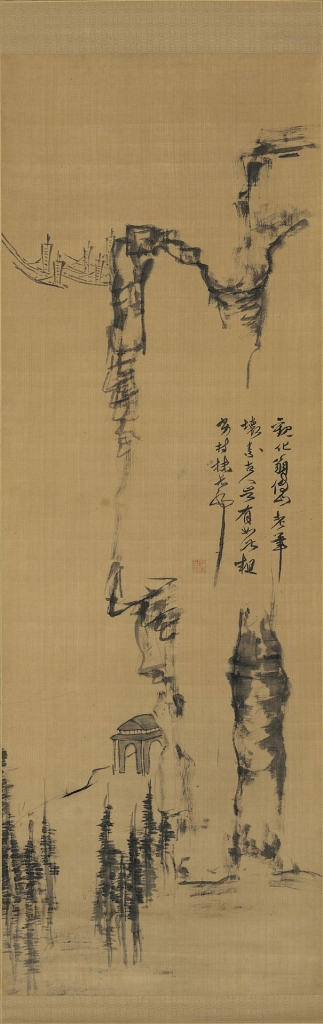 至於晚明四家中的張瑞圖,在日本的知名度更甚於中國。張瑞圖父子在泉州時,與開創日本黃檗宗的隱元隆琦、木庵性瑫都有交往。兩位法師先後東渡日本弘法,因此把張瑞圖的書畫介紹到日本,成為為江戶時代後期知識分子所憧憬的對象。世人對張瑞圖書法的印象停留在形如「金剛杵」、「柳葉風」的行草體,殊不知其小楷精絕,遑論繪畫。這件《拔嶂懸泉》立軸,若遮去題款,也會是張令人注目的繪畫作品,奇異的構圖在前景左半部加入鳥瞰視點,觀者隨山嵐、飛瀑直入丘壑,直視山峰頂端的房舍屋瓦,遠景對角處可見揚帆點點,行於水路,亦可見下方懸崖的高聳奇險,孤峰拔地而起,山路險絕。在山間密林尋找通幽小徑,而山石飛白、冷峭的輪廓如同張瑞圖迅疾的書法線條,銳利中帶有個性,布局疏密有致,一副奔流到海不復回之勢,氣象萬千。