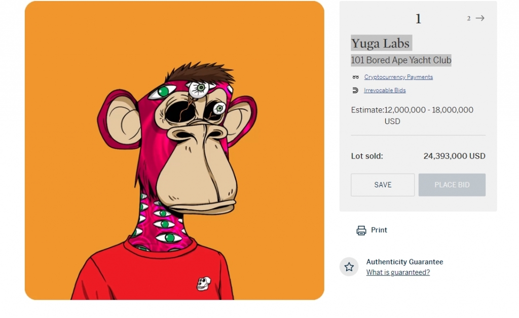 9月9日,經過約一周的競價纏鬥之後,在蘇富比平台上的101隻無聊猿,加上M1和M2「突變血清」(mutant serums)各3份共6支捆包銷售,以原先1,200至1,800萬美元估價,最終以遠超估價的2,440萬美元售出。每隻猴子的平均成本約為24萬美元,換算成當天匯率約為66 ETH,較當日均價43 ETH高出甚多,想必是因買家認為這101隻猴子中有特定幾隻具備更大的增值潛力。