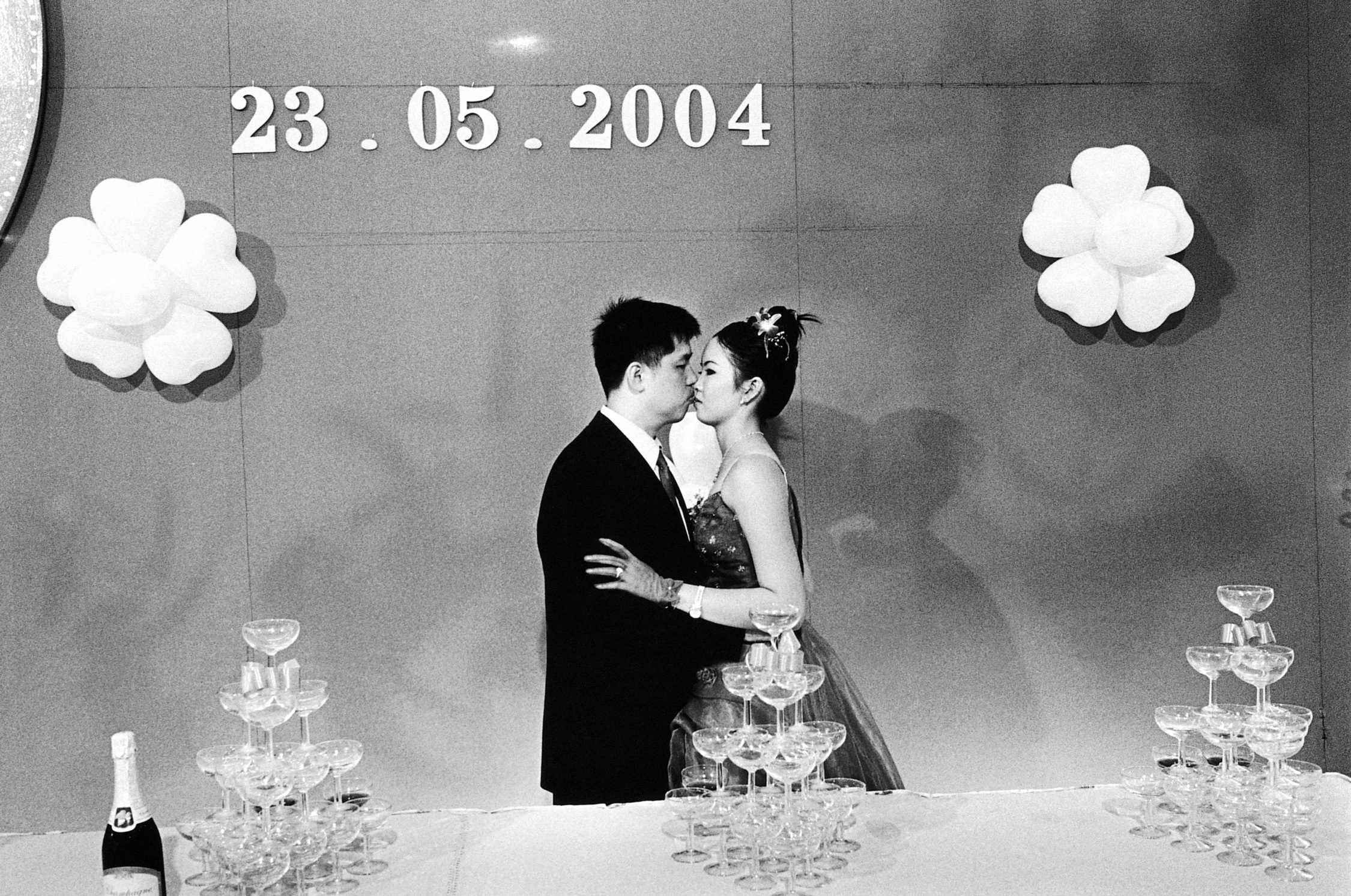 《囍》則源於他對2003至2004年,臺灣每年約有一萬人,娶越南新娘的社會現象感到不可思議,於是跟著仲介去越南六到七趟,捕捉到眾多越南新娘的茫然,令人深思跨國婚姻淪為買賣的問題。「當地仲介婚姻是一條龍作業,會發生什麼事,宛如生產線一樣都可以預期,上百個年輕女孩,被臺灣人用難聽的話品頭論足,五天內要把所有證件辦好……,我從中看到很多無奈。」