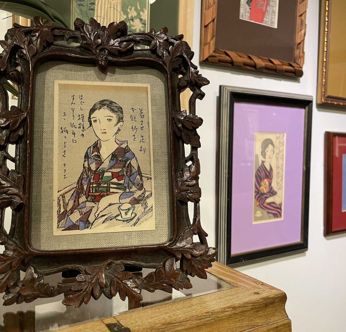 竹久夢二並非學院出身,也不依循當時創作者透過官方藝術展會尋求出世機會的典型道路。從家鄉岡山到東京念書打拼的年輕歲月,雖對繪畫有興趣,卻因為家庭期待進入早稻田實業學校就讀,1905年起積極投稿短文插畫至各媒體如《讀賣新聞》副刊、社會主義刊物《直言》與《中學世界》等等,並獲得刊載而增加自信,更堅定創作之路。(註1)除了個人畫展之外,竹久選擇以當時最新興,且最能深入大眾生活的出版和雜誌媒體作為自己揮灑創意的主要舞台。也因此他的創作媒材廣泛,不限制在特定領域,留下的作品包括文學、裝幀設計、繪畫與人偶等等。熱愛他的收藏者廣泛來自四面八方,特別是他最為人所知的創作符號,即擺脫過去日本傳統美人畫窠臼,深邃大眼,姿態慵懶卻帶有魅惑氣質的夢二式頹靡美人,在現今的眼光看來亦充滿著文明開化之後,和洋混合的獨特時代情調,此種圖像基調亦反映了後世凝視眼光下的「大正浪漫」。例如此次舊香居展品當中,最引人注目的,便是竹久最知名的美人畫作《黑船屋》,畫面上他一貫的頹靡美人主角,抱著黑貓,對著畫框外的視線頻送秋波,呈現出痾娜多姿美人的誘惑魅力。