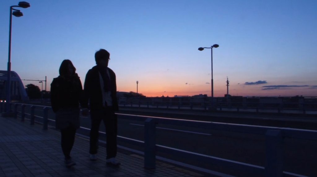 濱口竜介另有一項標誌性手法,即是大量採用交通工具上的內部空間作為拍攝場景。雖然「車窗是影像生產的景框」此一說法有點老派,但我也很願意將其視為「虛構作為寫實的擴充」。當虛構的劇情「在車上」運轉中,寫實的地景卻不停在窗外飛逝,虛構與真實時間因此彼此疊合;在《親密》中,人物對話搭配著鐵路車廂的行進,以及片末兩人分別在不同行駛路線的車廂中奔跑著彼此揮手、丟飛吻,直到最後兩輛列車分道揚鑣,都寫實地展開鐵道線的真實時間與鐵路空間。兩位主角在多摩川的丸子橋上,從黑夜凌晨走到黎明曙光的顯現,都是攝影本體論——攝影鏡頭作為時間的紀錄本質得以彰顯。
