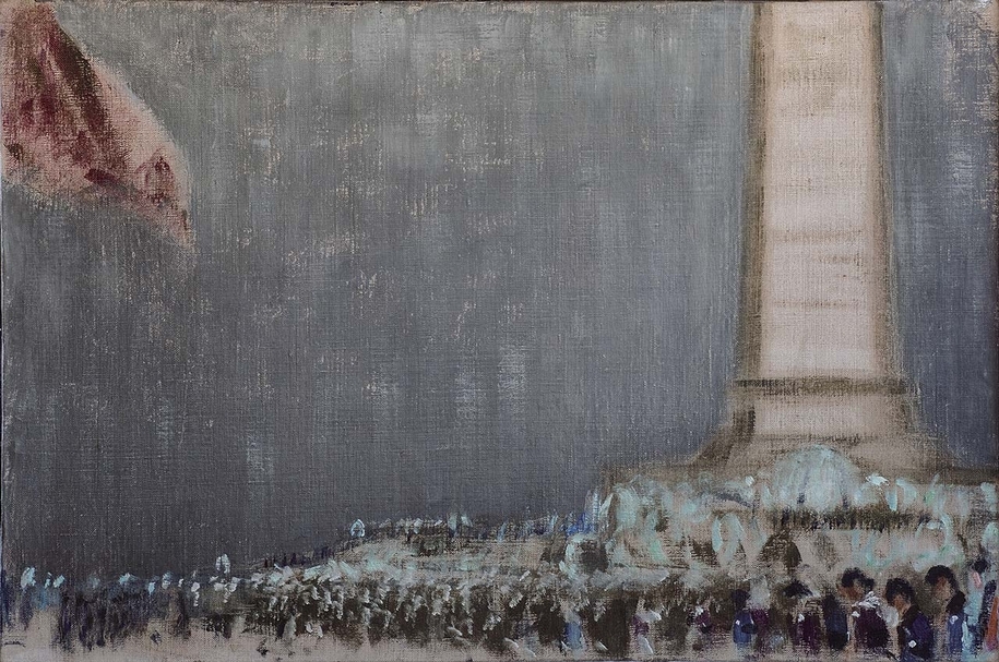 同樣令人印象深刻的是不同標誌性歷史事件在展覽中,直接或間接透過兩位畫家的畫面落下了印記。以趙文量為例,無論是1966年文革期間「紅八月」時轉而前往十三陵寫生、畫下無人風景(《八月十八日》),還是1976年「四五運動」時直接繪出天安門現場(《中國人的悲哀》),以及文革結束後以象徵手法描繪一個民族的失落(《一窮二白》,1976),都在在體現出兩位藝術家與時代製造出疏離感的同時,實際上也以充滿現實關懷的「天真」,表現出他們所獨具的政治性。