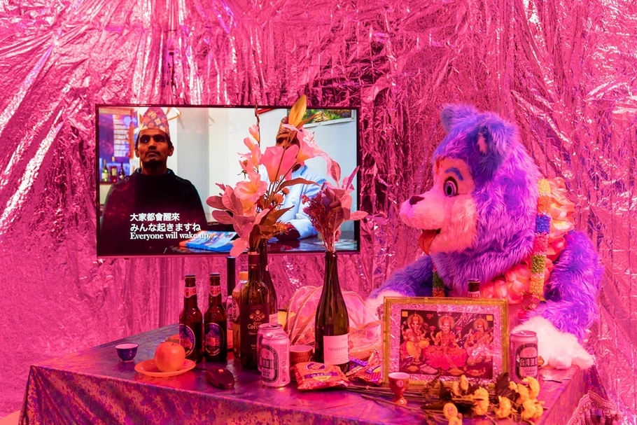 由此可見,此次展覽中指涉到台灣議題的藝術家們仿若都在進行一場跨越國界藩籬的異文化實驗:以一種混血的跨地域想像,回應與破除各種讓被殖民者陷入「我的文化不是我的文化」焦慮的後殖民式情境。日本藝術家磯村暖也有類似的特質,他將LGBTQ的繽紛派對與尼泊爾移工的宗教儀式結合,透過邊緣族群跨文化的連動與融合,碰觸日本強力維持表面和諧的主流社會,最不願意面對的邊緣與底層之餘,也回應全球性經濟下的移工與經濟制度:我們總是會找到相同困境的夥伴來一場文化結盟。