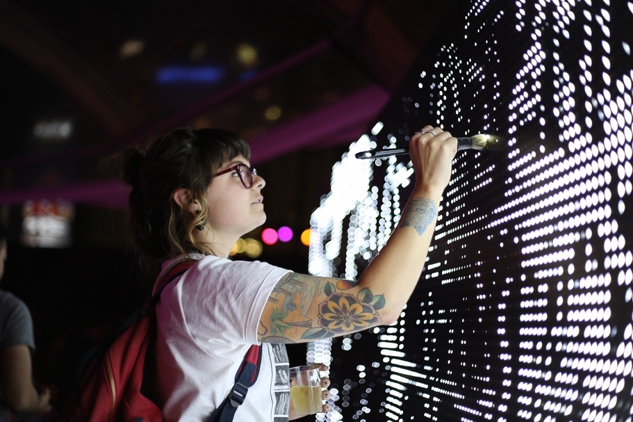 以數千盞的LED燈鋪成《水燈塗鴉》,透過筆刷和噴霧,讓民眾揮霍互動創作自己的作品,不只是從藝術欣賞的角度,在白晝之夜的夜晚,你也成為藝術家!