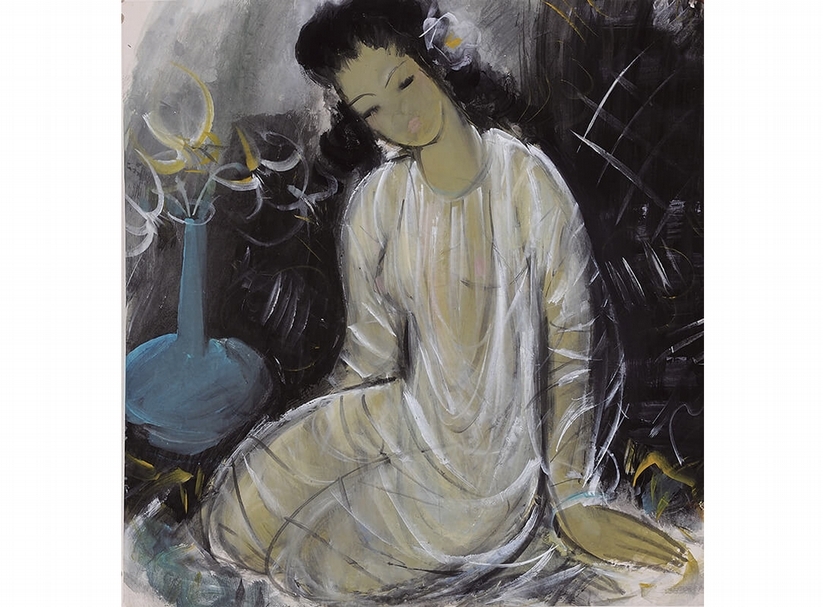 《仕女》首現拍場是在1990年的紐約蘇富比春拍,後此件作品出版於《觀海樓藏海上書畫集》。透明的白紗掩映仕女的身體,浪漫典雅,有如月下。細眉鳳眼的白紗仕女,和身後的藍色花瓶以及黃白相間的白色花蕊相呼應,在墨色渲染的黑色背景映襯下更加突出,靜坐仕女在輕煙細柳般的閒談優雅之中,又隱隱帶著一種寂寞惆悵之感。整個畫面層次分明,用筆簡練、流暢,呈現著含蓄而純淨之美。