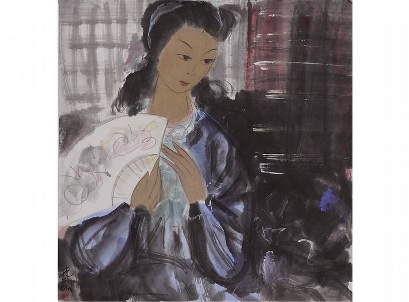 林風眠筆下的仕女,氣質高雅,古典與現代完美結合,總是在皚皚惆悵中寄託著畫家的心緒、理想和審美追求,仿佛也有著對現實的曲折寄寓。《夏涼圖》,畫中國傳統仕女持扇造型,中近距離取景,鵝蛋形秀麗的臉龐上有著纖細的眼睛,淡淡的彎眉和小小的嘴。她的姿態嫺靜文雅,眼瞼低垂微微頷首,十指纖纖持扇沉思。背景中的織物重彩潑染,豔而不俗,突現藝術家對形象張力與色彩的體悟,在率性筆墨的同時,又帶入了東方境韻的審美體驗。