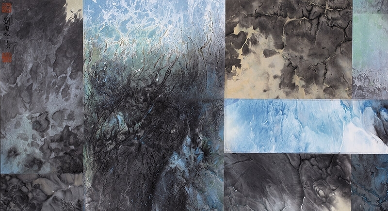 劉國松《拼貼的山水》.設色紙本.120×60 cm.1988。