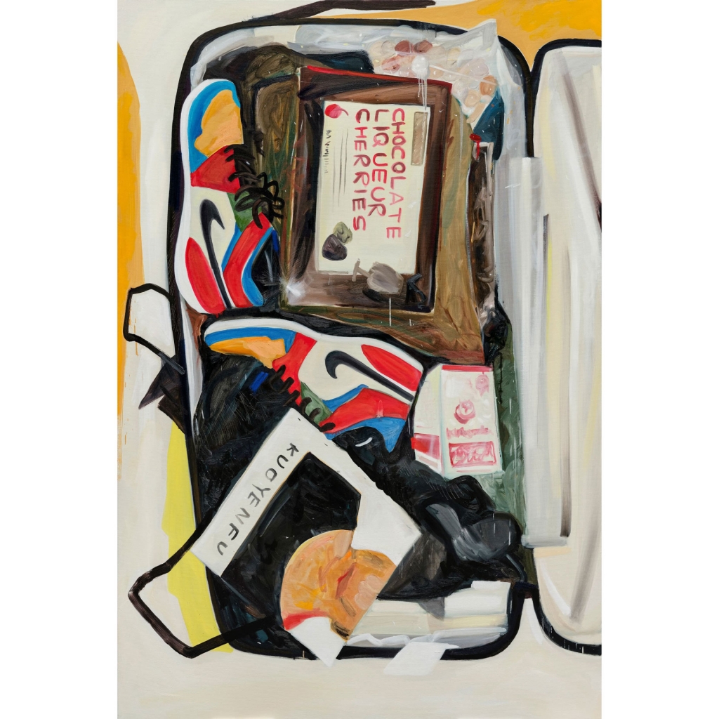 在作品的形式上,行李箱系列較常看到的表現,是郭彥甫以鳥瞰角度描繪行李箱的「內裝平面圖」與呈現衣物凌亂狀態的「俯視山積圖」,行李箱在畫面上僅作為物件的背景與框線,具有內框架的裝飾趣味。早期的作品郭彥甫多以寫實的手法、高彩度、明亮的色調描繪物件,此次展出的作品卻是省略物件的細節,無論內裝是井然有序或堆積如山,我們可以看到他著重的是色彩、筆觸與肌理在畫面配置上的變化與協調,例如《2020 流感》、《天天喝》等,或是像《Blue》冷色系的作品,越來越擺脫寫實性,趨向繪畫性。