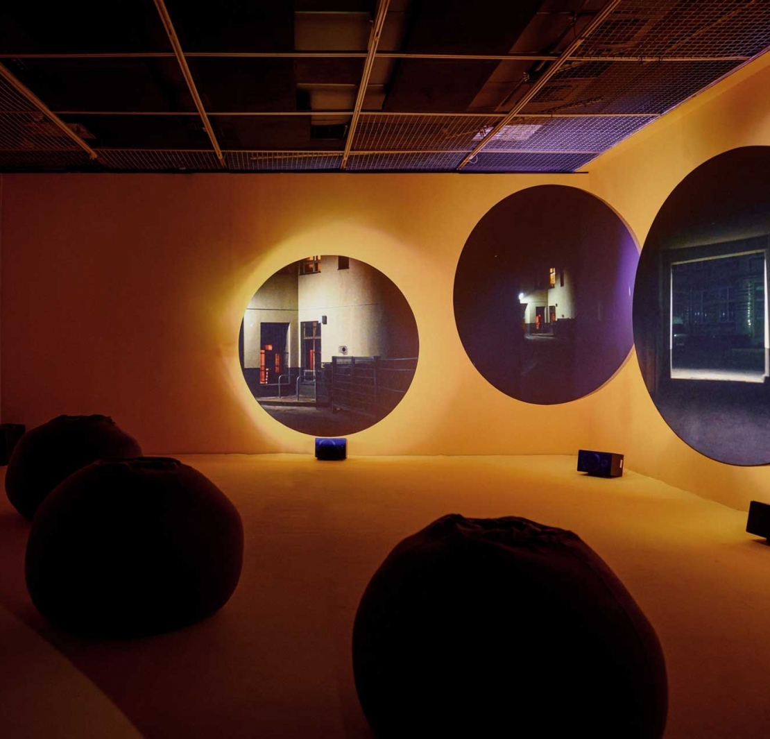 而與《功夫流感》放置同一展間的是—看起來以印刷製成的中文疊字圖像,他解釋相關圖像全以手繪所構成,作品企圖模擬出機械列印的狀態,如橫向噴墨般一條條線去構成字體的圖像輪廓。而這些文字其實是疫情後,在中國網路被自動屏蔽的特定關鍵詞彙,這些關鍵字原本不該被複製與傳播,卻在致穎的作品中如同密碼般的被再現,企圖揭露數位生活裡我們無意間被隔絕與不可見的匯聚,其言簡意賅的作品形式與《功夫流感》的對應,隱約已經為觀眾鋪陳了理解內間作品《打光》的前言。