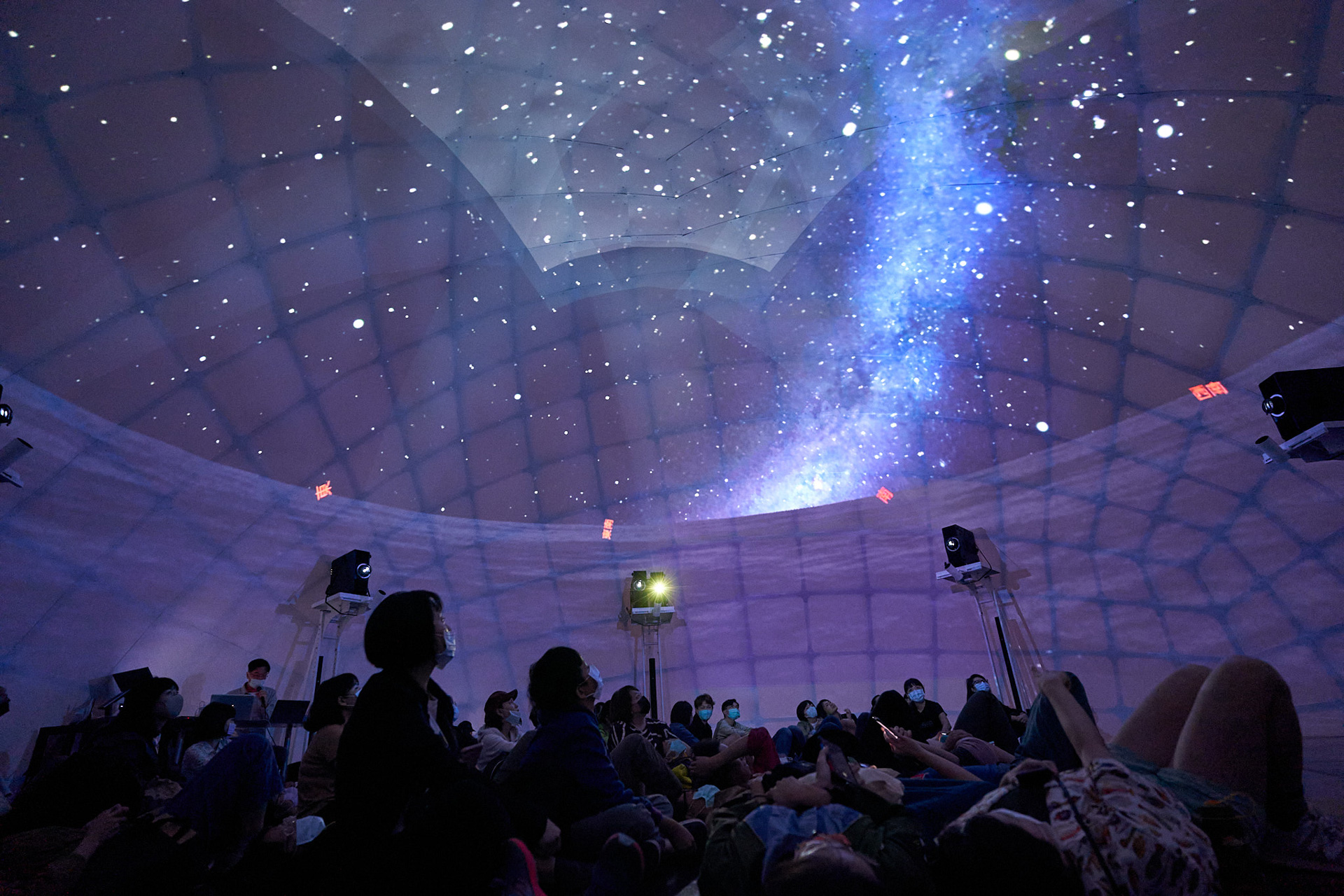 2021展演計畫首度啟動公開徵選,這座臺灣唯一的戶外半球型展演空間引起各界躍躍欲試,包含:實驗動畫、時尚走秀、大型商務展演均投件,而徵件的40組作品中,評審委員最後聚焦於「未來視覺」主題決選出八組藝術家/團隊,作品領域涵蓋音像藝術、劇場實驗、音樂等不同面向,以及兩組國際邀請作品。來自日本擅長實驗音像(Audio Visual)的藝術家田所淳(Atsushi TADOKORO)新作《和諧複變》透過調性與非調性的音樂和弦交織,回應當下社會和平與衝突共存的現況。現居德國的秘魯藝術家艾力克斯・格瓦拉(Alex GUEVARA)《瞬時》,藉由光和聲音的變化展現微觀元素從空無中誕生的瞬間。