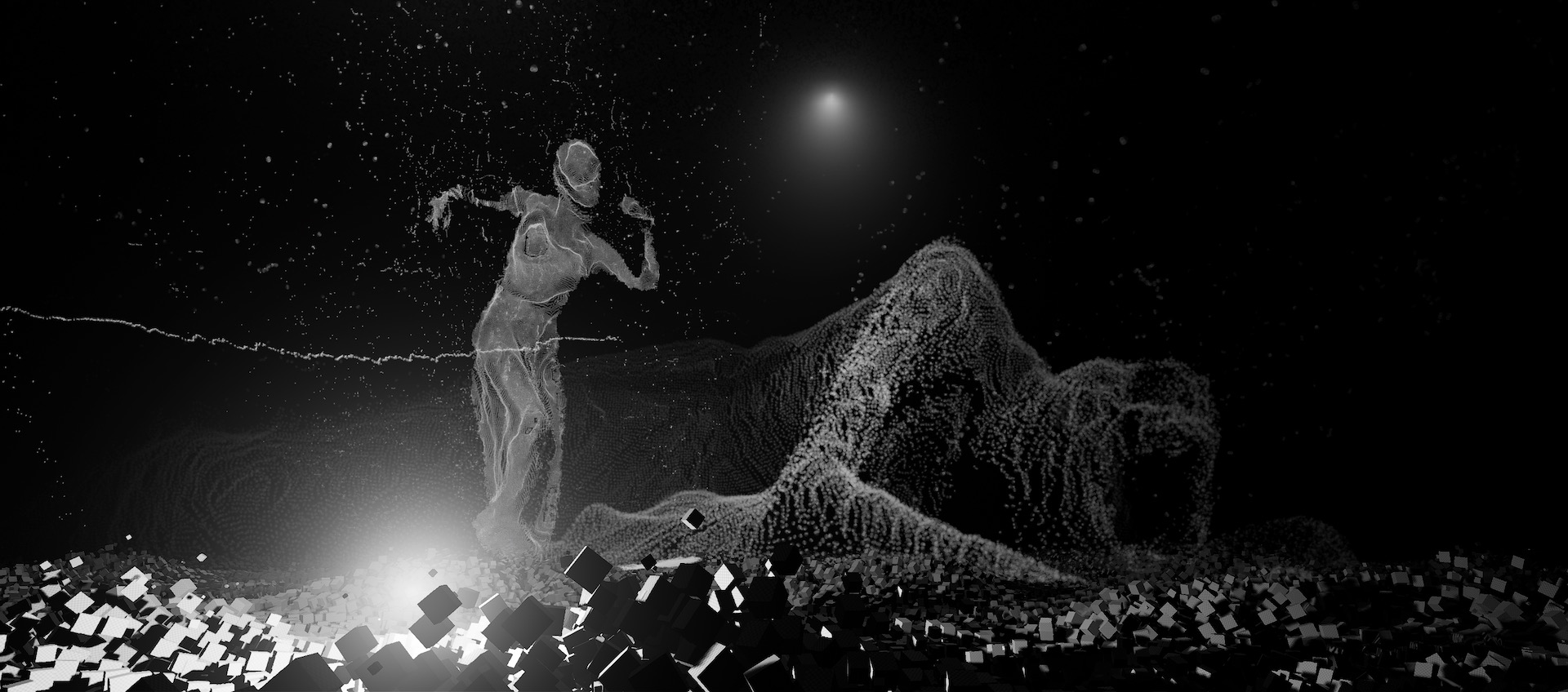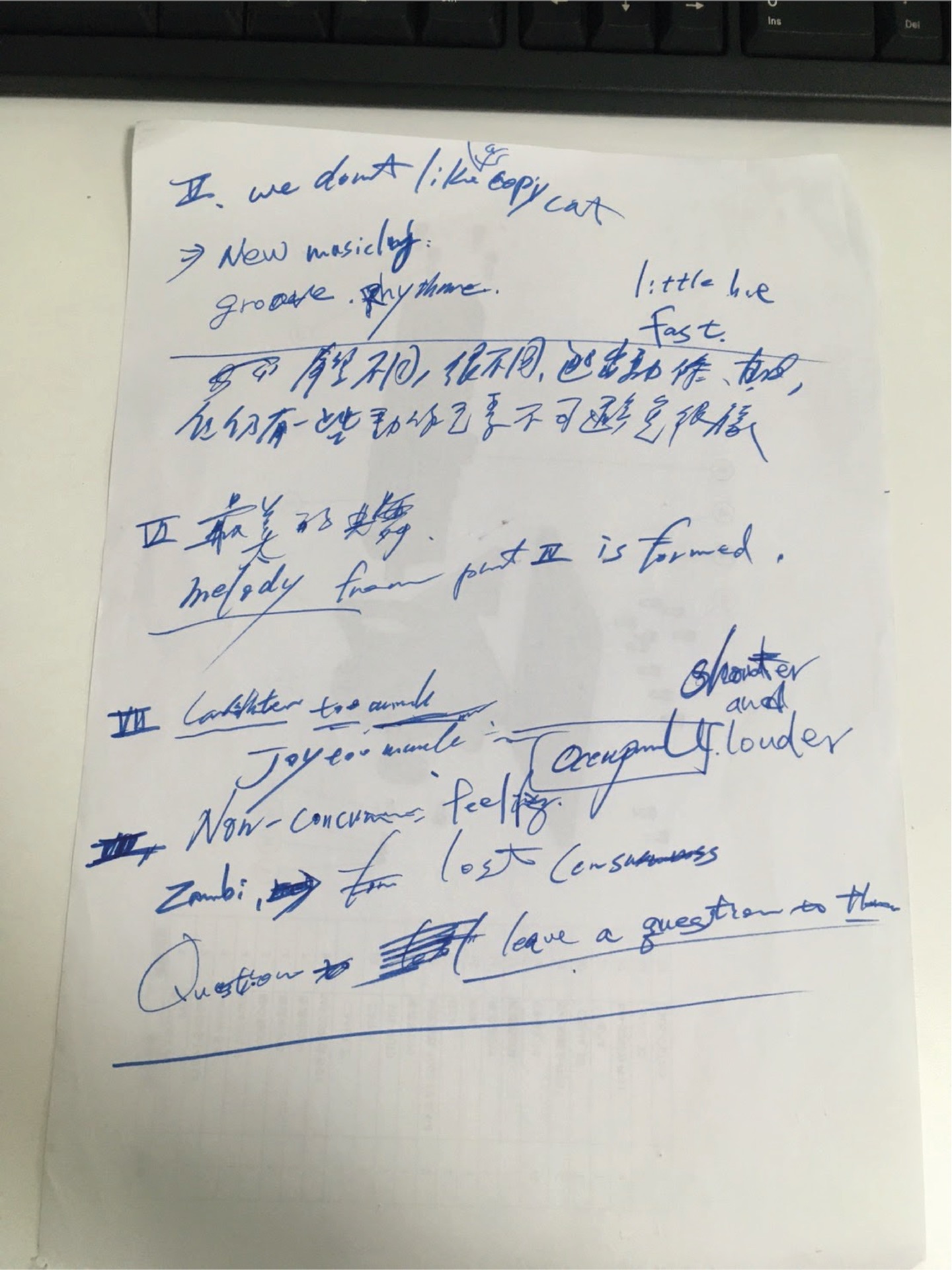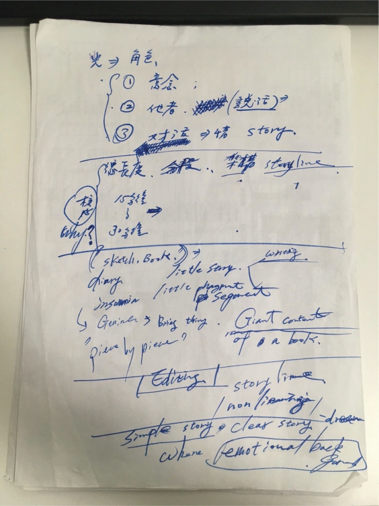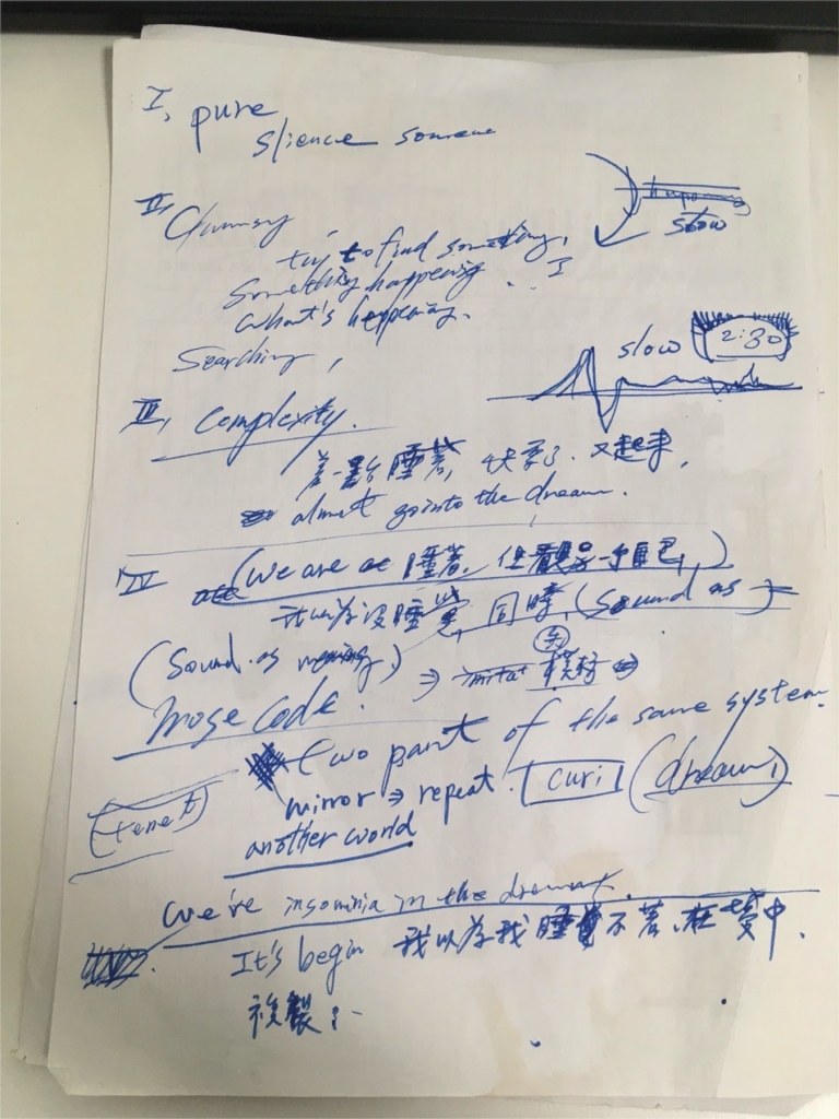 這樣的鋪陳策略也可見於新作《失眠寫生簿(2020/2021)實驗版》之中,從外在人造物件聲響干擾導致的失眠,遞進至自然聲響所造成的失眠,以及最後自我內在對話而成的失眠狀態。不過回推至創作發展階段,陳乂闡述在確立媒材形式之後,同樣須與義大利作曲家共同找出主題與故事的「共鳴點」,而這回即建立自雙方都很喜歡的科幻電影《第三類接觸》(Close Encounters of the Third Kind,1977)中,外星人藉由聲音與地球溝通的橋段。而我們確實可以從作品前半看到相似性,聲光好似在向失眠者傳達著什麼訊息一般。但在經過一段時間的試驗後,他們認知到此一共鳴點不能只由創作者共享,而必須進一步地觸及觀眾,於是開始從原腳本探索更具共感的經驗串連。陳乂回憶道,在每次跨國線上會議前,大家都會閒聊、抱怨生活瑣事。一次談及失眠經驗,發現其為雙方乃至當代人皆頻受困擾的難題,因而以此開展成一由數個短篇集結成的「失眠寫生簿」。