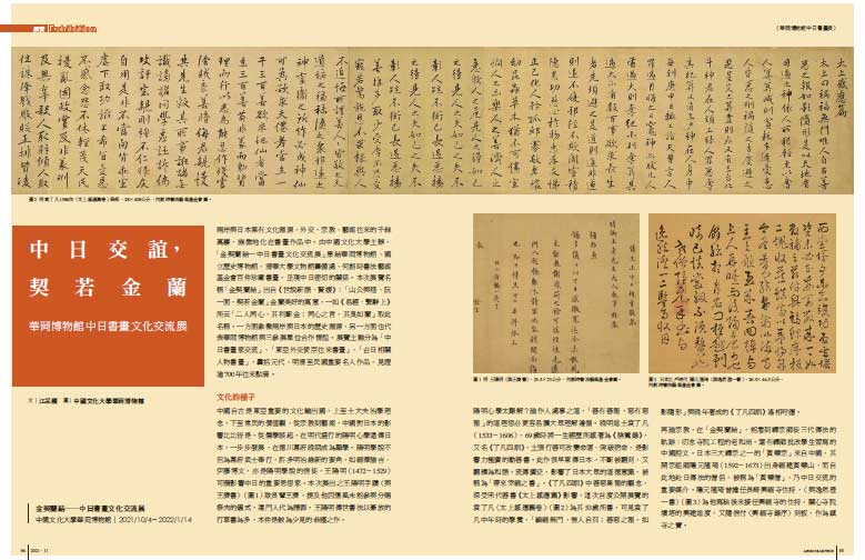 兩岸與日本素有文化淵源,外交、宗教、藝術往來的千絲萬縷,幽微地化在書畫作品中。由中國文化大學主辦,「金契蘭結─中日書畫文化交流展」集結華岡博物館、國立歷史博物館、清華大學文物館籌備處、何創時書法藝術基金會百件珍藏書畫,呈現中日密切的關係。本次展覽名稱「金契蘭結」出自《世說新語.賢媛》:「山公與嵇、阮一面,契若金蘭。」金蘭美好的寓意,一如《易經.繫辭上》所云「二人同心,其利斷金;同心之言,其臭如蘭。」取此名稱,一方面象徵兩岸與日本的歷史淵源,另一方面也代表華岡博物館與三參展單位合作情誼。展覽主軸分為「中日書畫家交流」、「東亞外交使臣往來書畫」、「台日相關人物書畫」,囊括元代、明清至民國重要名人作品,見證逾700年往來點滴。