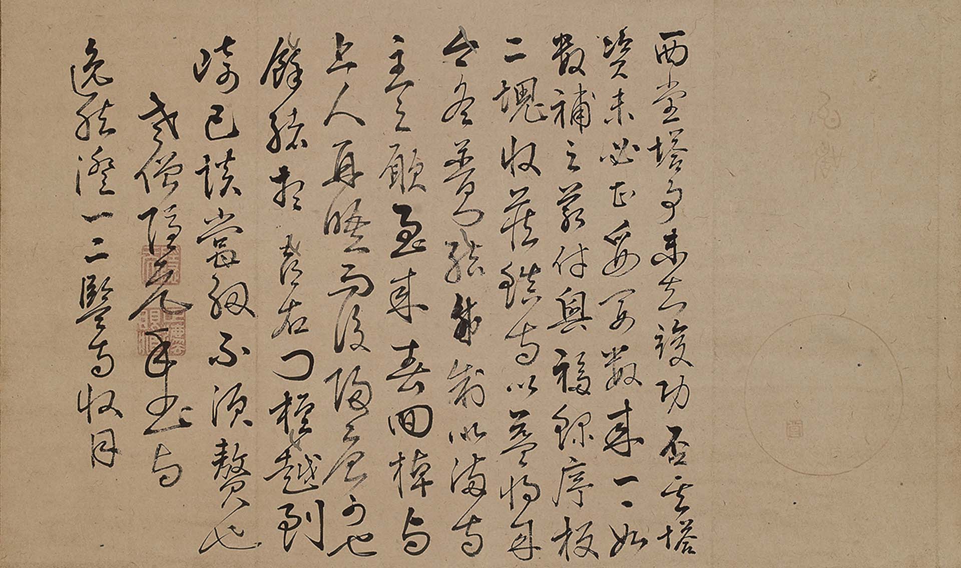 中國自古是東亞重要的文化輸出國,上至士大夫治學理念,下至常民的價值觀,從宗教到藝術,中國對日本的影響比比皆是。從儒學談起,在明代盛行的陽明心學遠傳日本,一步步發展,在德川幕府晚期成為顯學。陽明學說不但為幕府武士奉行,許多明治維新的要角,如福澤諭吉、伊藤博文,亦是陽明學說的信徒,王陽明可謂影響中日的重要思想家。本次展出之王陽明手蹟〈與王濟書〉致長輩王濟,提及他因傷風未能參與分賜祭肉的儀式,遣門人代為請罪。王陽明傳世書法以豪放的行草書為多,本件是較為少見的恭謹之作。