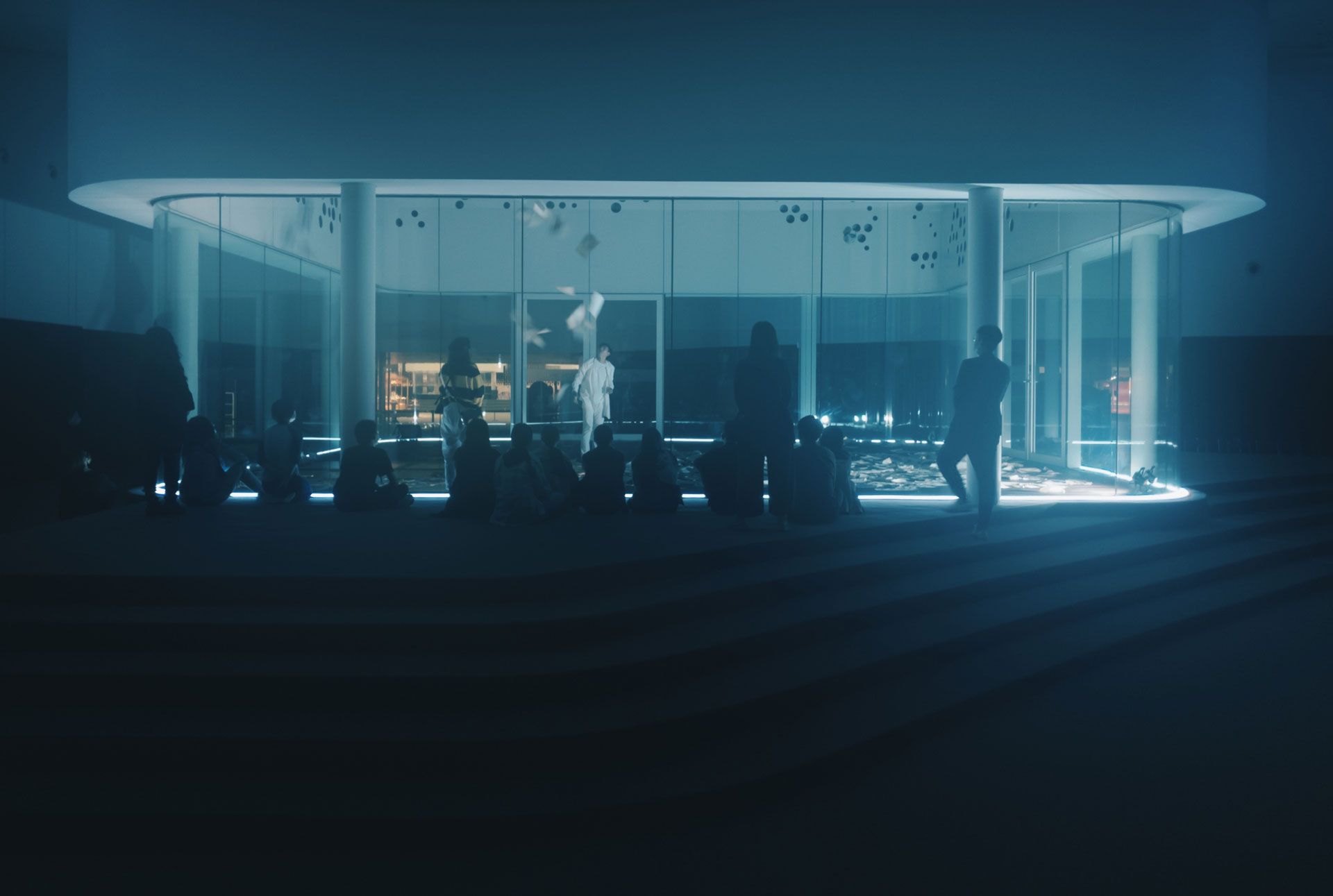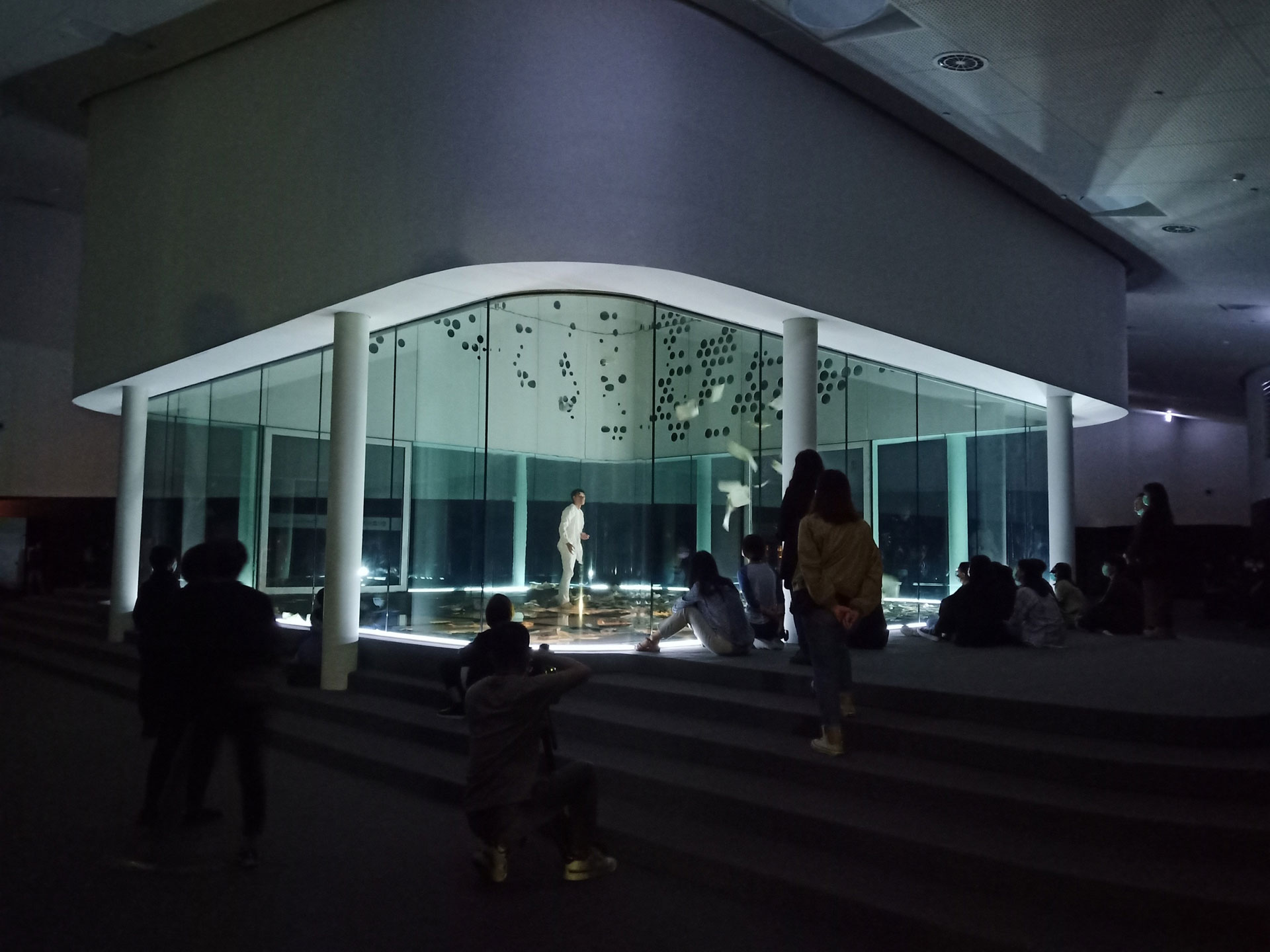 衛武營因為本身建築的設計,在非劇場的公共空間中,有很多有趣的空間可以利用。而衛武營播放的場所,就是在空間的露天中庭,觀眾戴著頭顯觀看《留給未來的殘影》時,風和細雨會自然吹撫到觀眾的皮膚上,因為人的意識在VR的世界中,會刷新感官的敏感度,「人的大腦會意識到VR影像是虛擬的,但人的意識又會想相信影像的真實,在這當中風和雨和身體的觸碰反而會比平常感受到的更真實,是種在虛擬中感受到比真實更真實的獨特體驗。」陳芯宜認為衛武營版本最驚艷的地方,即在於透過玻璃介質呼應VR媒介的特性。現場演出中有三段落,其中兩個段落,都是透過玻璃觀看,「觀眾的感受是很強烈的,完全是把VR感受給真實化。」