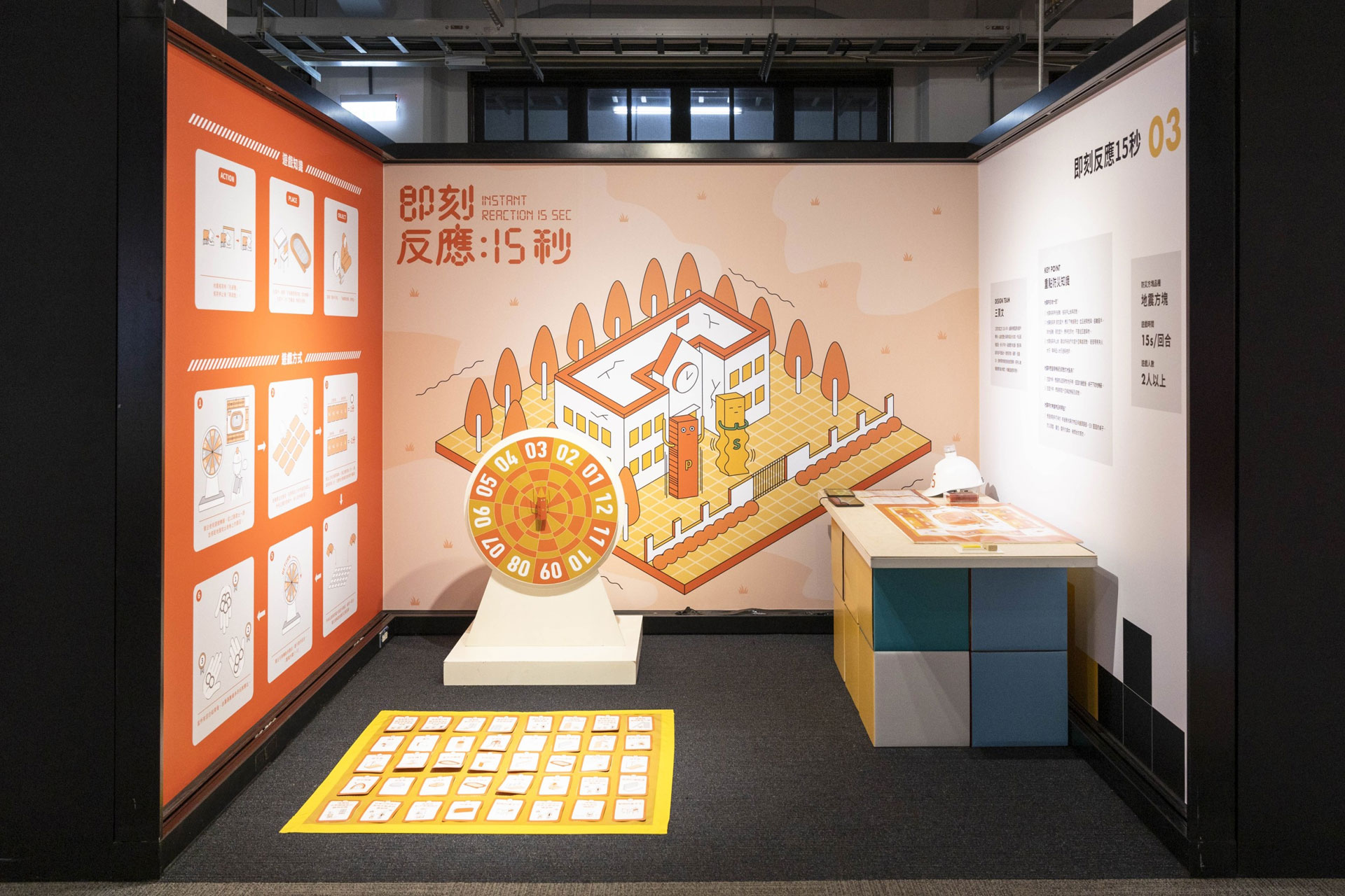 「火柴貓大作戰」桌遊中,玩家則是必須在時間內針對逃生問題回答出正確的應對方案,以類似大富翁遊戲的概念,最快從火場中脫困的玩家即可獲勝,讓玩家可以反覆記憶火場逃生的相關常識。「即刻反應15秒」由關主用選號轉盤選出題目,玩家需要在15秒內搶走桌面上所有正確反應的答案卡,是養成民眾正確反射習慣的遊戲設計。遊戲就將地點設計在學校,讓學童可以思考若災害發生在學校這個場域,可以怎麼因應,遊戲轉盤則會轉到不同校園的情境,如圖書館、教室、操場等,模擬地震來臨的狀態,要在15秒內緊急的時間裡找出應變的卡牌。
