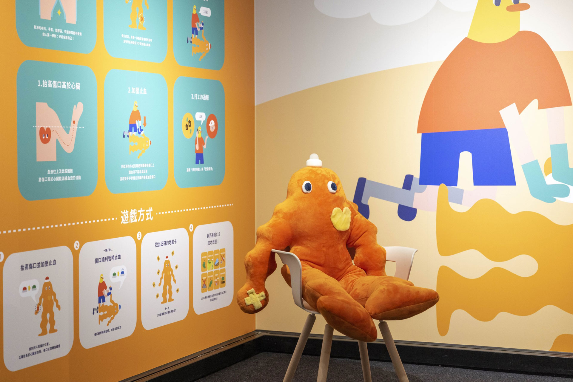 「鴨壓止血」,則是在訓練小朋友面對受傷的人,如何加壓止血、抬高患部、救援傷者,如果按壓位置與抬高的動作皆做到,玩偶上的燈就會變成綠色,表示救援成功。而「救救阿災」則是以一個類章魚造型的IP角色,企圖教導面對溺水的人的救援方式,要如何正確的拋出救生圈。