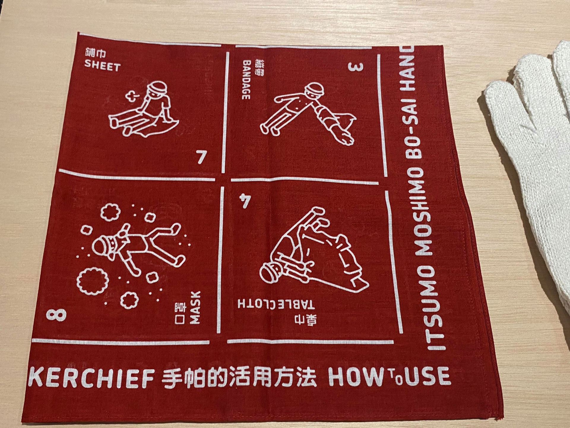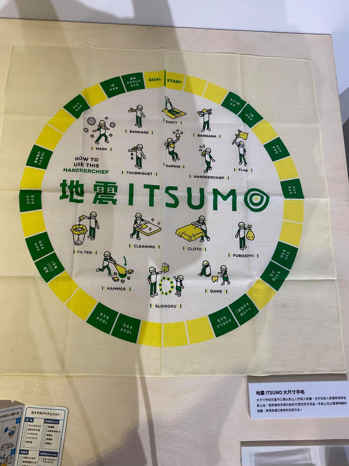 「消消防災」現場也展示了由東海醫院與小北百貨合作的實體包款,就是讓大家在購買日用品的小北百貨,就能認識到防災包的準備,而且可以使用一般雜貨百貨的商品,就可以建構實用的防災包裝備。台灣無印良品也與早起設計和水越設計合作,從台灣緊急避難包籌備經驗出發,在全台53家無印良品門市與官網推廣其概念。其中無印良品的避難包品項的設計中,亮點是印製防災避難指南的手帕,原因是手帕是避難過程中非常常使用的品項,遇到地震粉塵可以當作面罩,也可以包裹受傷患部等,所以包括日本與台灣的設計師都針對手帕做了許多延伸的防災設計可能。