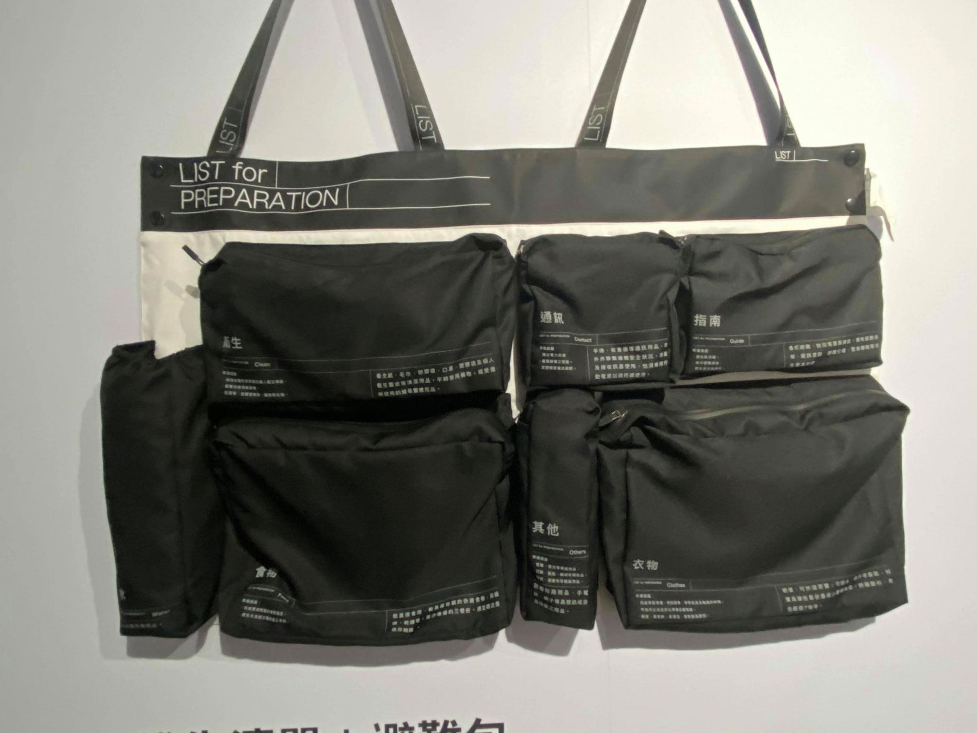 而慈濟基金會與選選研也打造的收納輕巧又分類明瞭的避難包,慈濟過往參與很多災後後端的賑災工作,他們也思考如何將資源提供到前端的預防,減少災難發生的重創。因此他們到很多鄉鎮去推廣防災,遇到很多長輩要和他們解說避難包的功能和應該放置的品項,所以和選選研打造的避難包更像是教具,將避難包整個平面化、透視化,讓長者更容易在平時就分類整理避難相關的用具。