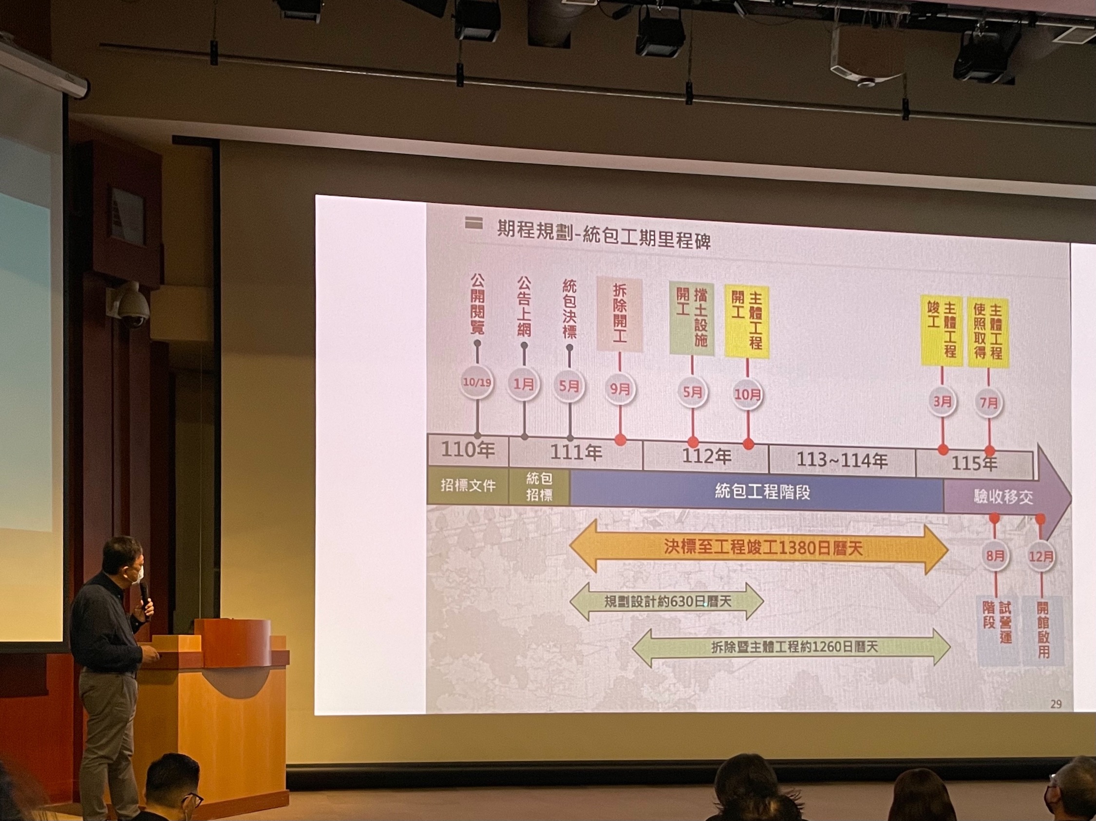 另外,在空間開發比例的配比中,根據北美館擴建案的空間需求面積比例表顯示,共有38%的面積規劃給停車位,比法定多了逾百個車位,依照北美館周邊的大眾運輸發達的狀態,以及在全球講求節能減碳,減少自用車的時代下,為何要在美術館中附設高比例的停車位,是值得再三思考的問題。最後是在統包工程期的期程規劃中,除了前幾個場次提及的工時不夠的問題之外,在規劃設計尚未結束,即開始進行拆除、開工,整體的規劃有許多出入,應重新審視加長規劃。