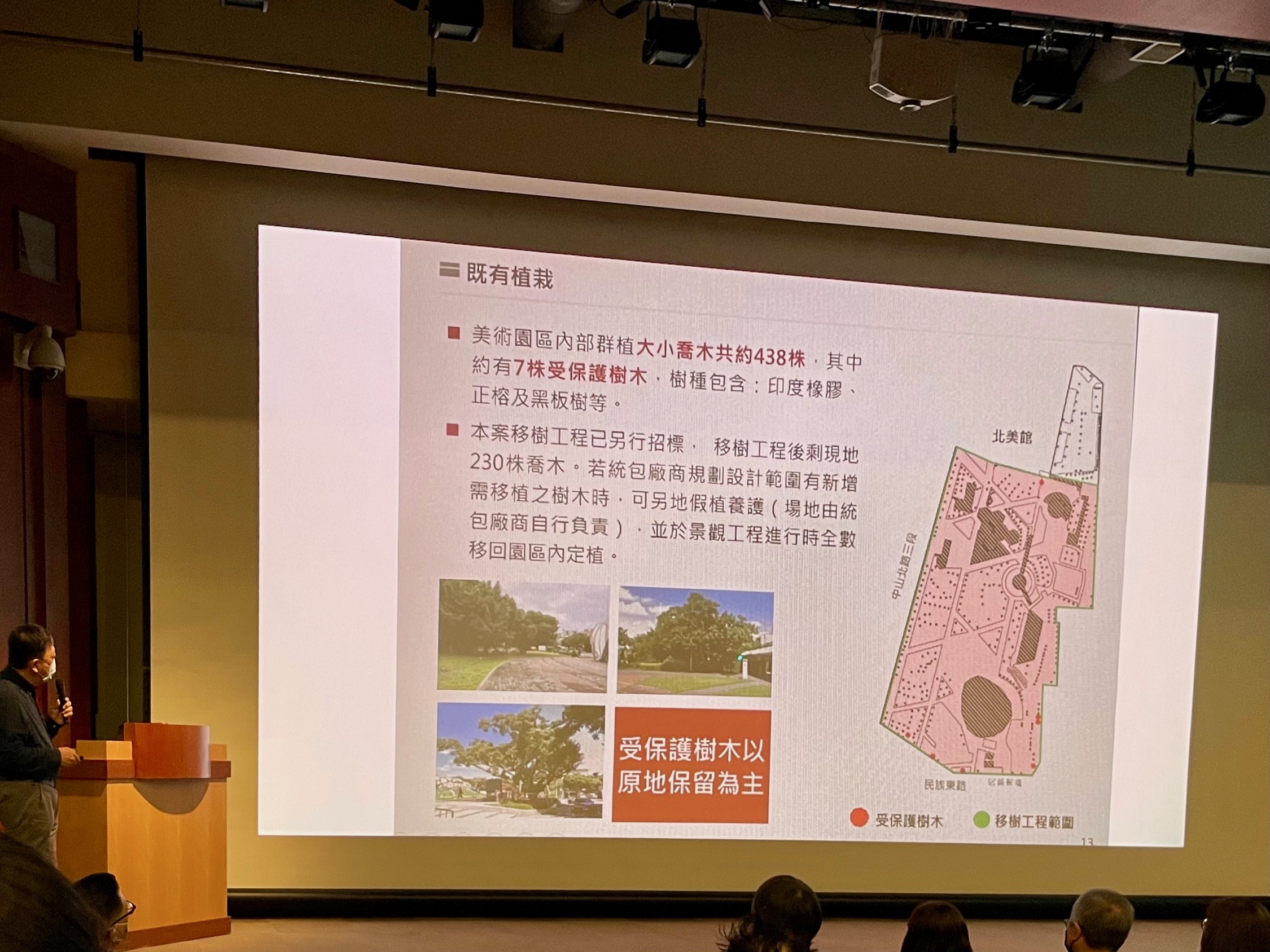 曾任職北美館館長的吳光庭從公園中的林間美術館定位切入,回溯台灣在公園預定地中附加文教設施如美術館博物館的傳統,在1952年所公布的第一張都市計畫圖,同時也是依據1932年日治時期的都市計畫規劃圖。不只是這次的北美館擴建案,國立臺灣博物館與二二八和平公園即為一例。若要在公園中興建館博設施,建蔽率實際上也是大過於公園預定地的上限規定,公園與美術館的使用定位也大不同,因此,北美館擴建案即將要在公園預定地中興建覆土式美術館,則必須思考公園與美術館之間的關係。然而,若依照現在的示意圖,想像未來美術館園區的樣貌,以北美館本館、新建庫房、北美館新館三個館為一體,但三者之間的關係,是否有些疏離?尤其在三館間的動線沒有直接關係時,本館屆時是否會呈現被孤立的狀態?此外,在擴建案中的移樹工程,根據《現有樹木保護暨移植工程計畫書》數據中顯示,目前樹木都已經編號,並標註哪些預計移植,現階段已移植238棵樹木,應再另外標示出被移走的樹木範圍,因為移樹工程與後續景觀、使用設計會有絕對關係。
