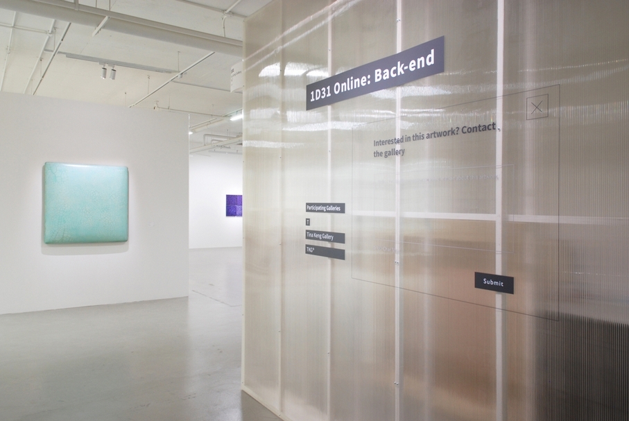 「1D31上線:後臺」並不試圖在這突發、海嘯般的時刻提供解答,而是思考當博覽會不再是畫廊此時此刻可以有效仰賴承擔銷售實體平臺後,畫廊如何在這樣的時刻,無論是透過實體、科技、新的社交模式,來揣摩出一個可以比擬博覽會在消費與藝術性都飽滿的場域。展覽的每面展牆,都試圖對應著線上展廳的頁面,網頁的後臺也如同藝博會現場,對應著只有VIP能進去的小房間,企圖將實體與虛擬的概念互相轉譯,也符合當下人們都在思索的課題—實體活動真的能被虛擬網頁所取代?