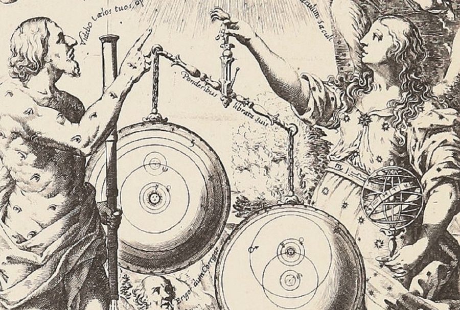 1651年,一位對多數人而言十分陌生的耶穌會修士,喬萬尼.巴蒂斯塔.里喬利(Giovanni Battista Riccioli)完成了他個人一生的巨著:《新天文學大成》(Almagestum Novum)。書中的內容儘管精采,然而真正重要的或許是卷首插圖中,那隻上帝之手所昭示的某種知識論的態度或傾向。在上帝伸出的那隻手中,上帝以三隻手指降下了三道諭示,關於創世的三大原則:數字(Numerus)、測量(Mensura)、質量/重量(Pondus)。