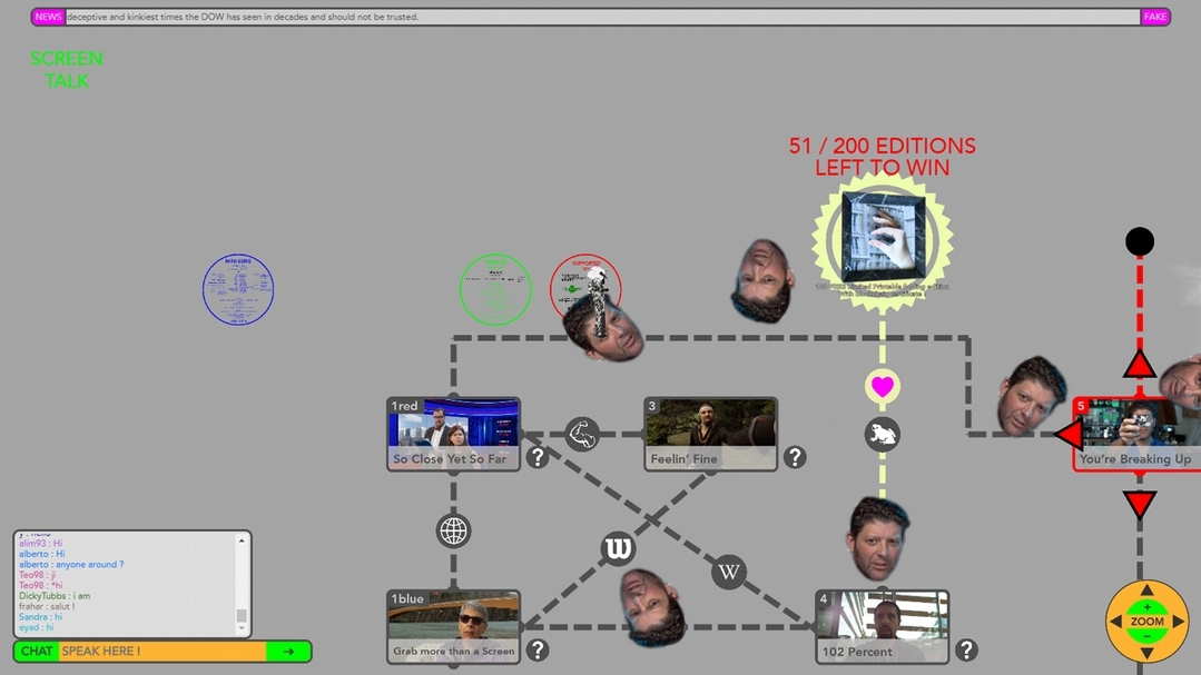 在網頁「screen-talk.com」這個令人迷惑的彩色迷宮中, 其互動美學喚起了早期網絡藝術的實驗,內容嵌入藝術家2014年製作的《回家就是我與你同在》(Home Is Whenever I'm With You)的lo-fi五集迷你影集——在2012年爆發中東呼吸綜合症冠狀病毒(MERS-CoV)之後,一部極為諷刺的、業餘表演的、關於瘟疫大流行的迷你影集。而本次新的網路遊戲則完全是在瘟疫期間所構想製作的。這個Java網站的閃爍界面,帶我們重新回到90年代,彈出式視頻、即時聊天以及一系列遊戲,觀眾/玩家必須選擇一個人物化身進入遊戲,更可以獲得藝術家所贈送的獎品——他自己的作品。玩家在遊戲中要繼續前進或觀賞另一個劇集,則需要不斷執行不同迷你任務,回答一些瑣碎問題。