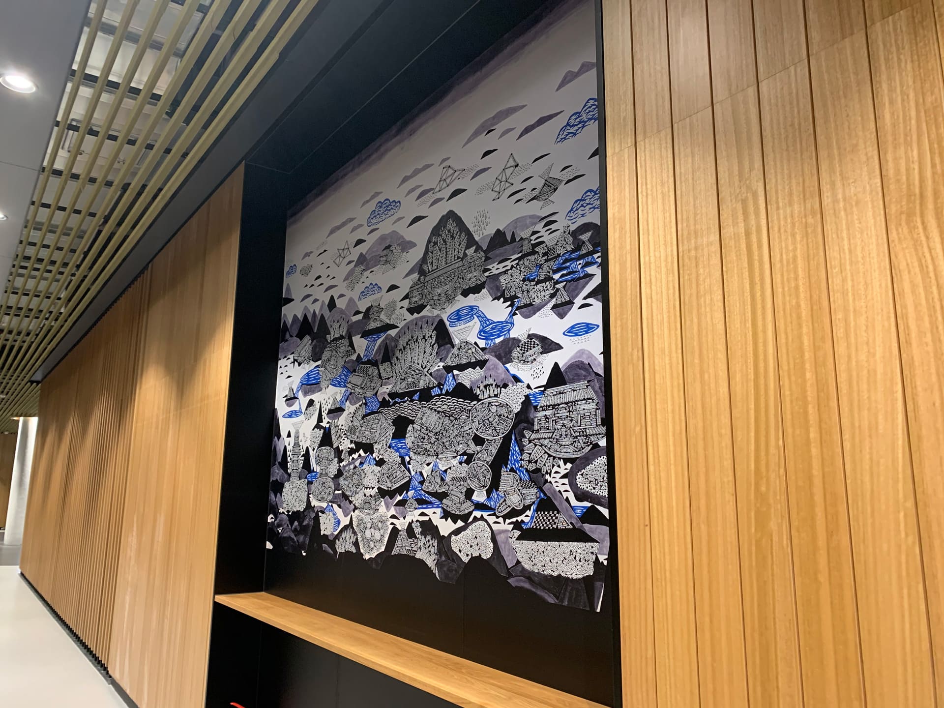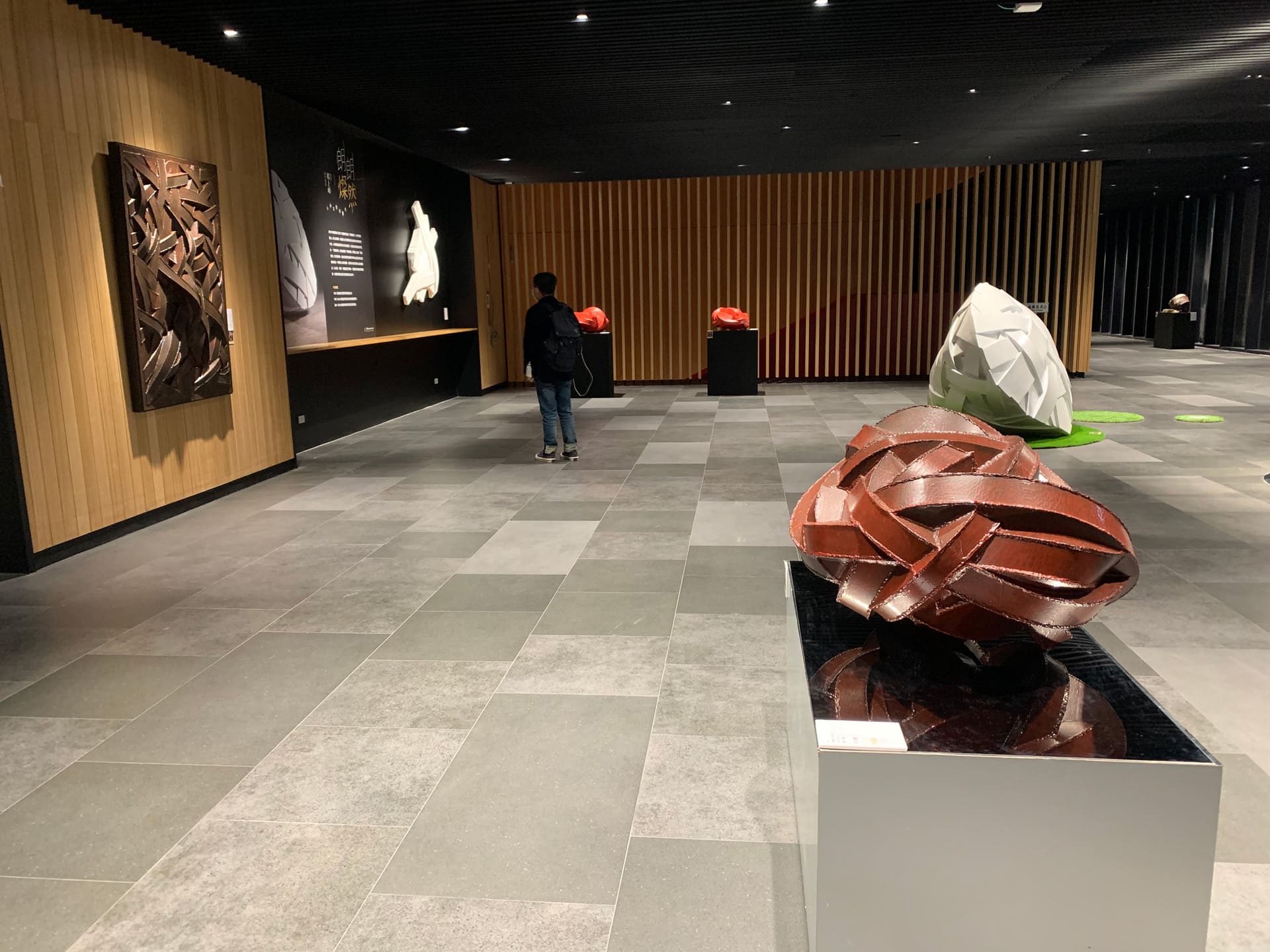 更值得稱許的一點在於,建築師在置放不同屬性的空間盒子時,設計了相當多型態的展示空間,除了有胡氏藝術承包的公共藝術案,當中有三件作品展示,其中最具亮點就是大廳處書頁翻飛,由英國藝術家保羅.考克斯基(Paul Cocksedge)設計作品《陣風》(Gust of Wind);在一樓、三樓都獨立出展示間,裡頭有故宮與圖書館合作的「藝起冒險:一場始於十七世紀的數位旅程」,內含「傳說秘寶」、「乘風破浪」、「冒險地圖」三項展覽計畫;二樓、頂樓畫廊與討論間則有臺南在地的當代藝術家,如梁任宏、林書楷、舒媞等人的作品展示,分別以裝飾和展覽方式呈現。