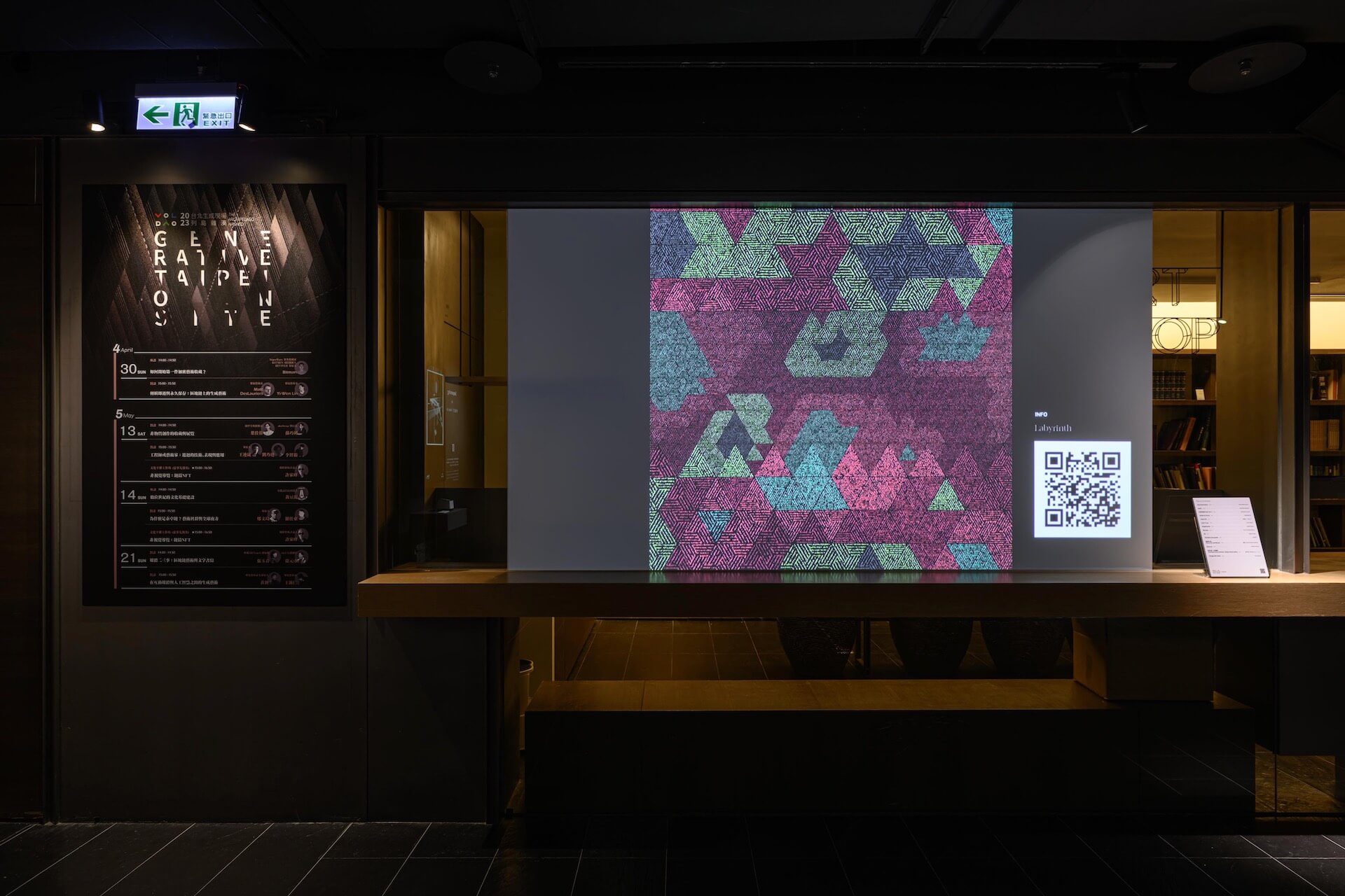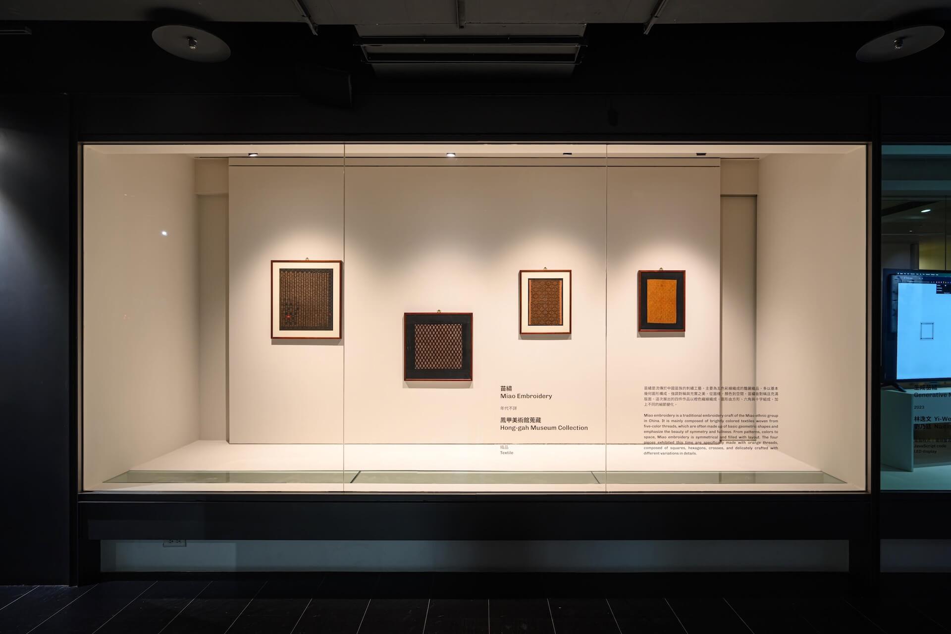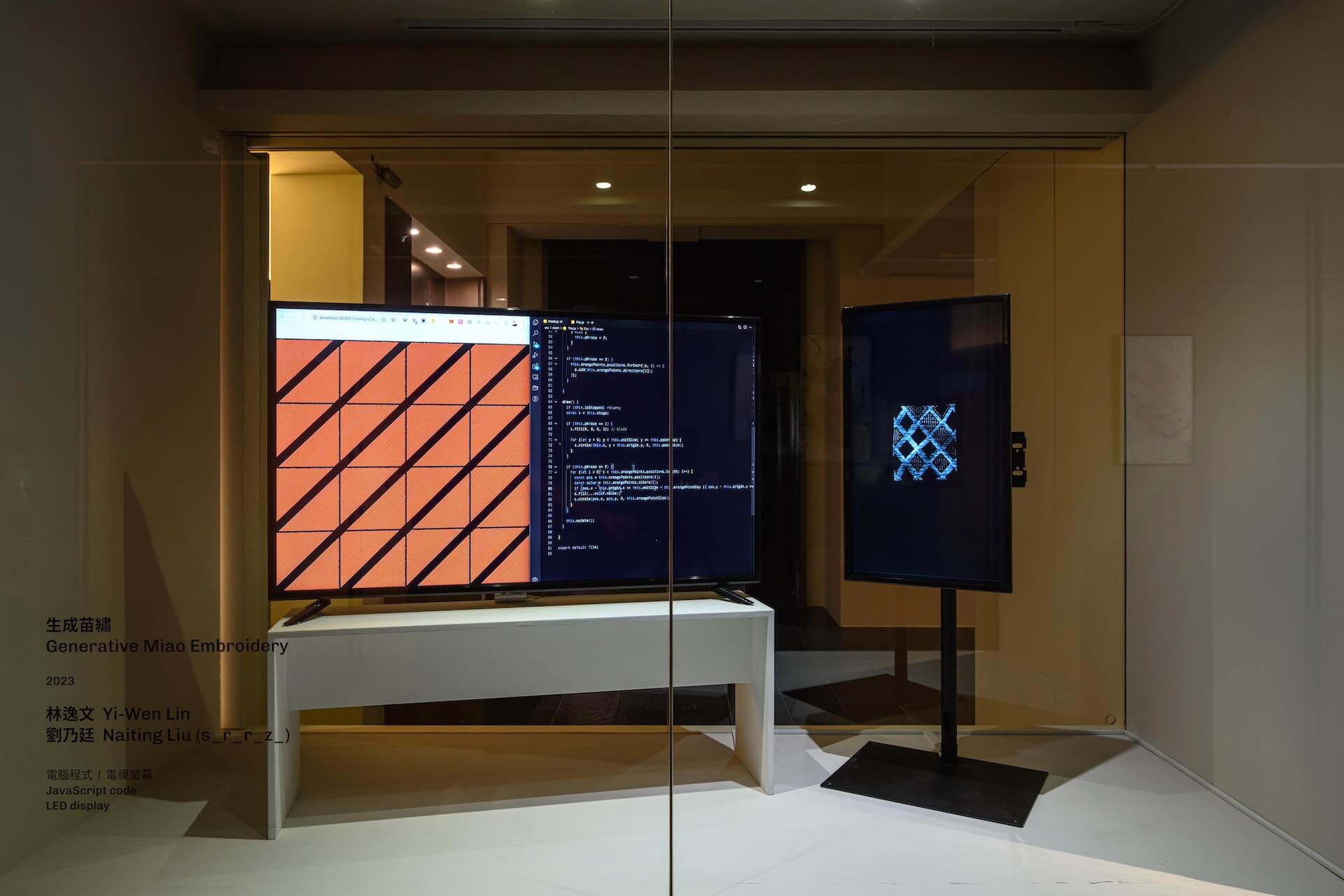 4.與實體藏品的對話,利用展示場域鳳甲美術館的館藏—苗繡(Miao embroidery)的幾何構成圖形,有著重複性,卻也有著細節的差異。林逸文與劉乃廷皆以生成藝術的手法回應鳳甲美術館的苗繡館藏。