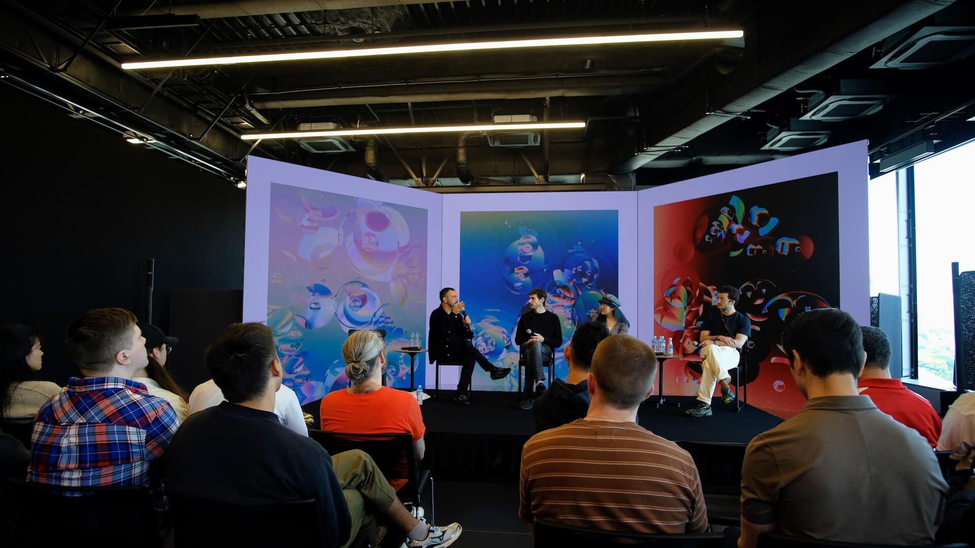 官方活動還舉辦了藝術家講座,邀請這次參展的藝術家針對多個區塊鏈藝術史和議題進行對談,不論是the funnyguys、MonkAntony和主辦人Seth,一路從60年代的生成藝術史聊到對於NFT的未來與期待,進而大談他們創辦Le Random的初衷;抑或是聽Zancan在講座會場批判以太藝術生態和大聲對Tezos示愛,都十分過癮且精彩。看著前一晚還在大秀像素風格的LED背板和派對現場,立刻一秒轉換成學術講座對談的場域,場景之間不論是風格或是功能的轉換,的確是BM團隊相當擅長的地方。