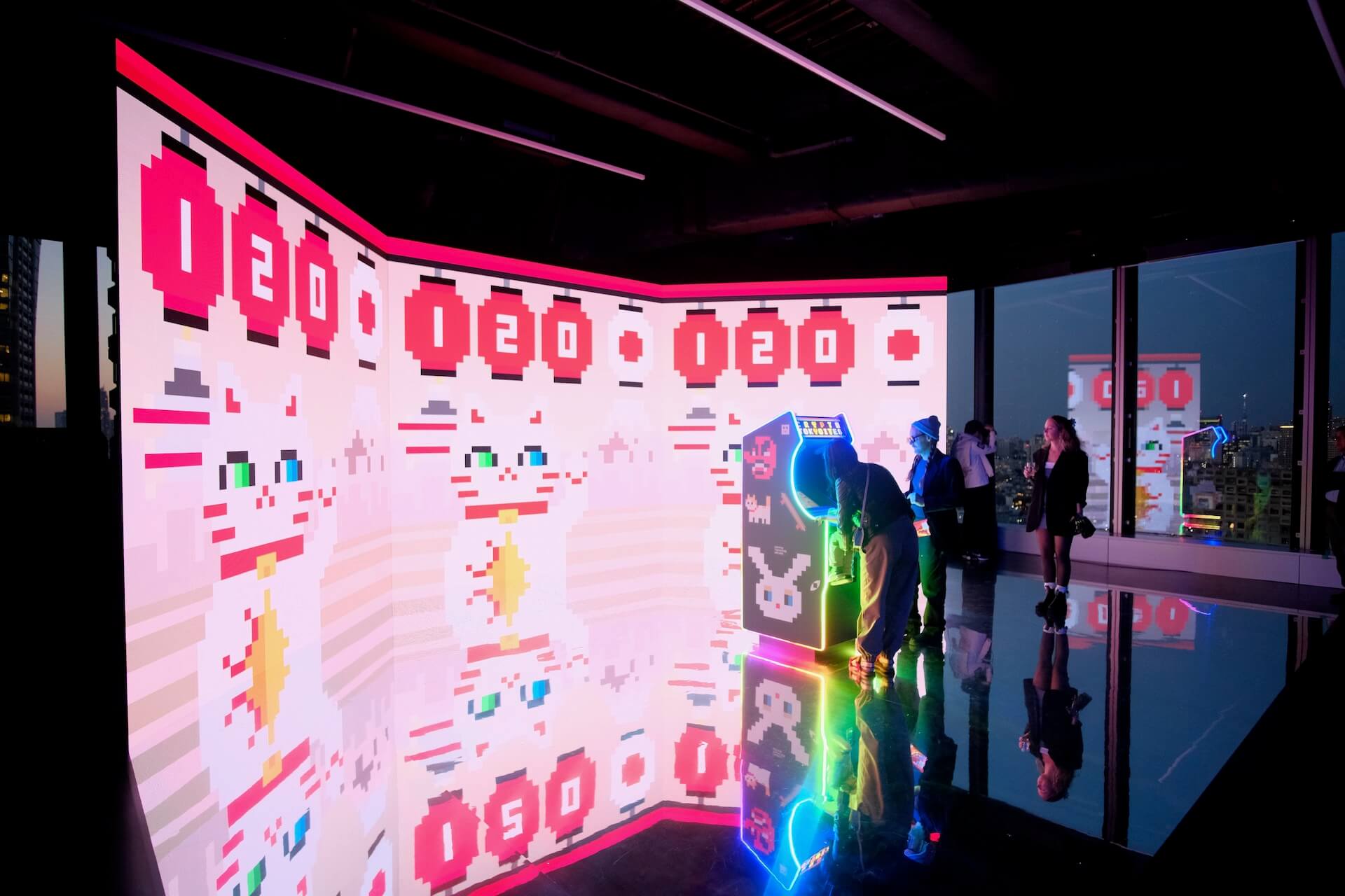 「Crypto Tokyoites」的現場中間,放著一個大大的遊戲機台。鏡面地板加上三面超大LED銀幕展示著他們像素風格的PFP系列視覺,這裡絕對是最熱鬧的超現實派對現場。現場有兩位主持人負責炒熱氣氛,也指引你下一步動作。一開始他們會發給你一枚硬幣,好讓你能啟動遊戲機台,啟動機台後,輸入你的Crypto Tokyoite編號,主持人們會一邊帶領你勁歌熱舞,一邊感受鑄造出來的喜悅。最後,那個專屬於你的Crypto Tokyoite將會投在大大的LED牆上,讓眾人為你歡呼。