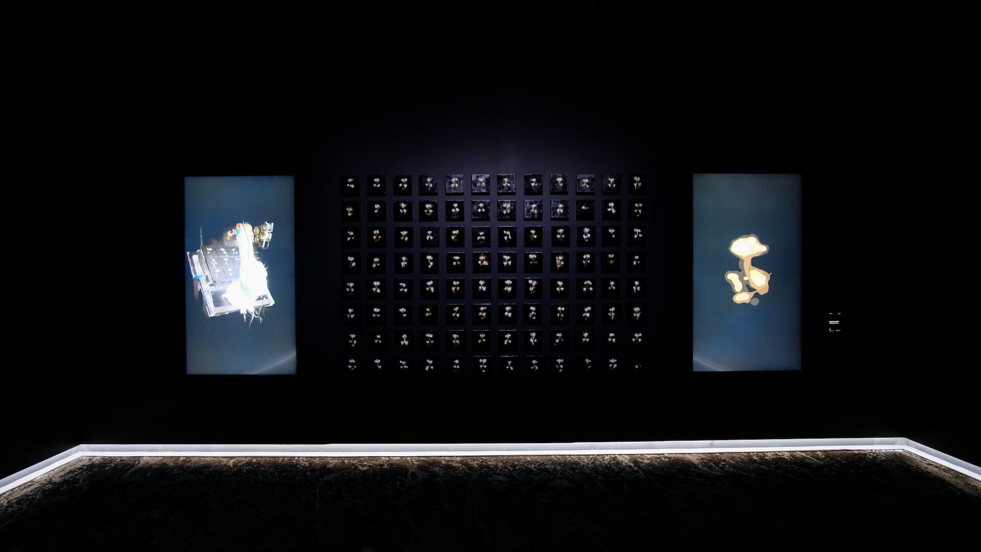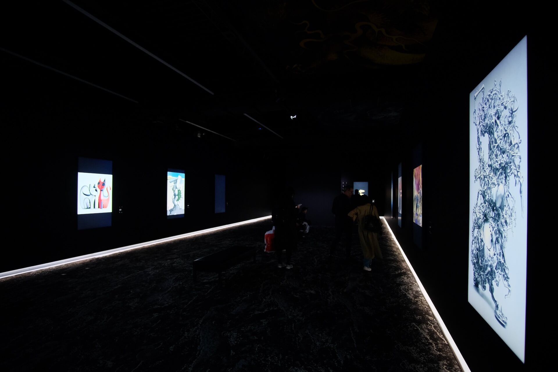 第二間房展出的是「AI Collection」,燈光幽暗的空間,彷彿來到高級畫廊。兩排螢幕顯示著10位AI藝術家的大作,數位顯示的作品資訊牌,可以直接掃碼鑄造,也會顯示目前作品被鑄造到第幾號。而在這個展間的盡頭,則展出了Pindar Van Arman的《AI Imagined Faces : On-Chain》。這個系列作品號稱純粹鑄造在區塊鏈上,不是只是純放在IPFS空間(據說花了10ETH來鑄造)。現場兩個螢幕展示了藝術家創作的過程和現在剛被領取的作品,正中間100件IRL的作品則是整整齊齊的掛在牆中,你可以仔細端詳每一幅畫作裡的臉龐,細細品味他們的異同。這個系列花了藝術家五年的時間,也成功地在展場中吸引大家的目光。