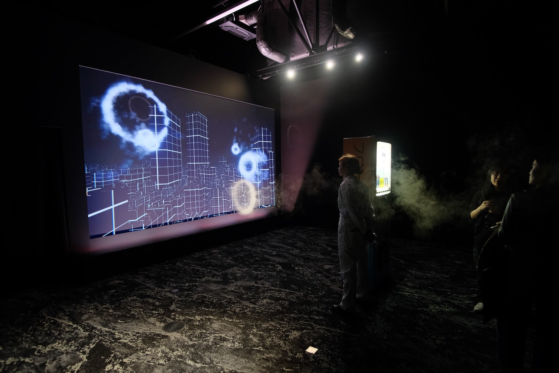 最後,我們來到「Japanese contemporary」展區,這裡集結了當下東京最棒的區塊鏈藝術家。各種不同風格的藝術家匯集在這裡,展場的盡頭一樣是這個展間最有趣的地方,一個大型的煙圈互動裝置 – 藝術家AAMurakami的作品《Floating World Soda》。房間的中間有一台飲料販賣機,當你選擇的飲料掉下來時,背後的裝置會隨機吐出煙圈,並且投向販賣機後方的大螢幕,在那裡你會得到一個完整的遊戲體驗和一幅屬於你的城市場景,每個人得到的畫面都不一樣。