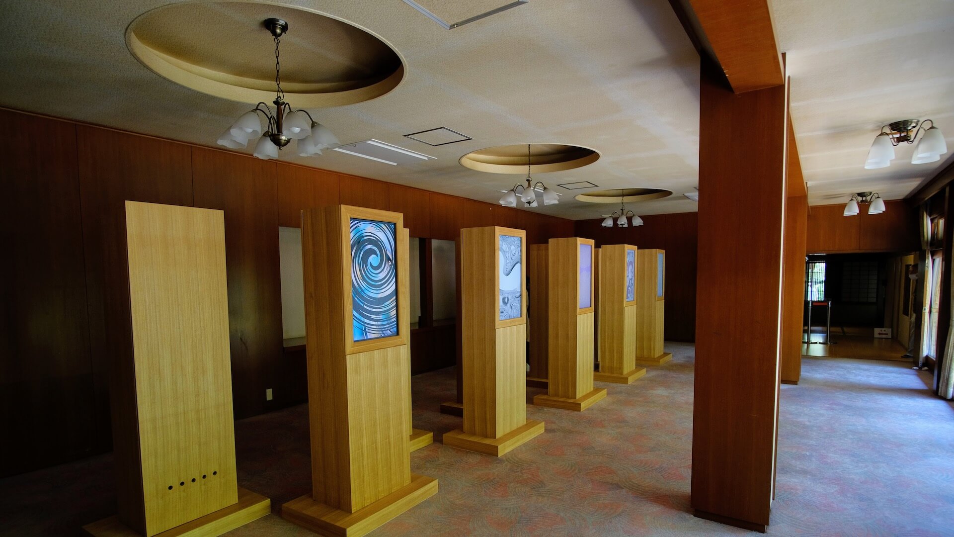 爾後,導覽的工作人員請我們感受這個氛圍(vibe),帶著這樣的心情好好的去觀賞自己鑄造出來的收藏。配合螢幕的是十一個特製的木座,避開了其他榻榻米的房間和空間大小的考量,選擇在第一會議室做為展覽空間。我們到會議室展覽空間時,已經有其他藏家和藝術家在這裡小聲的交頭接耳,討論目前展示出來的作品。B請我們把在車庫拿到寫有作品編號的單子拿給C,並說C會帶我們去到我們的收藏面前。在這段時間,我們可以靜靜地看著自己和他人的收藏,有非常足夠的時間和寧靜來細細品味作品裡面的每一個細節。