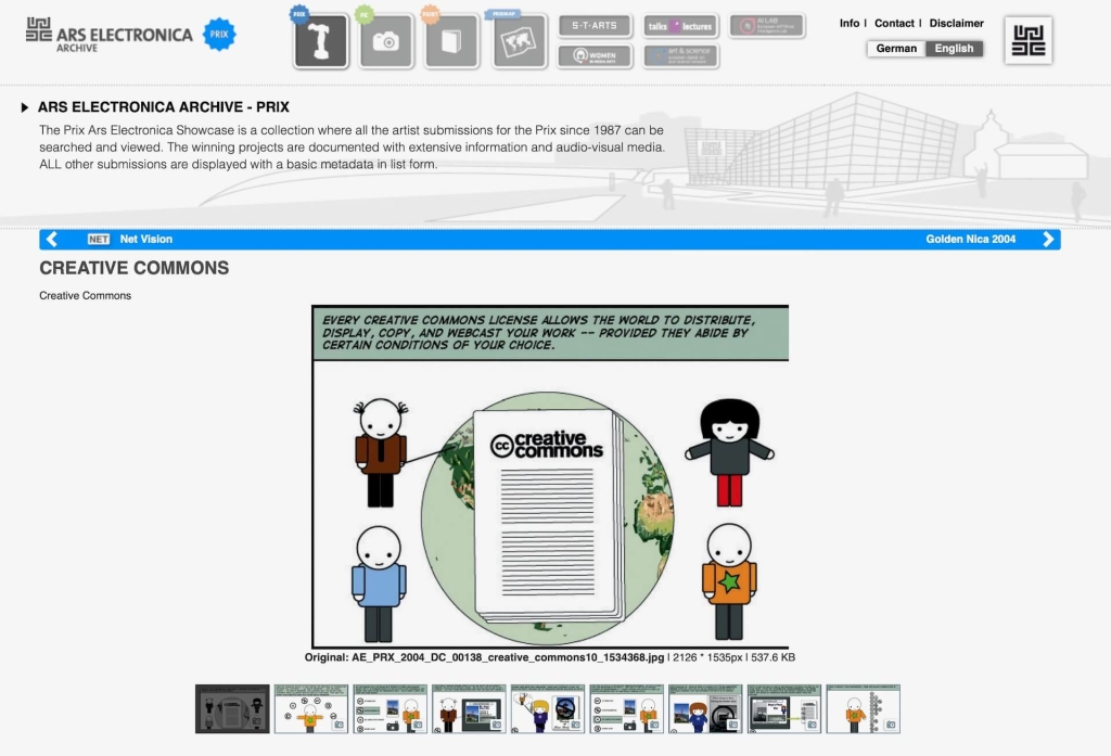 網絡先天上帶有易於複製與共享的文化基因,樂於協作與堆疊的自由軟體開發者社群,也因此演進開放原始碼授權規則,如BSD、GPL、MIT條款乃至於更寬廣的CC創用授權。創用授權(Creative Commons)於2004年獲得林茲電子藝術大獎網路藝術類的最高殊榮金尼卡(Golden Nica)。「創用授權」影響網路世界深遠,但「創用授權」是藝術嗎?為何它可以獲得最高殊榮?