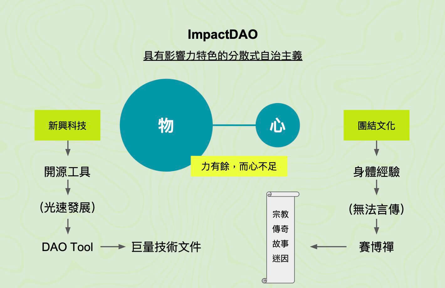 黃豆泥在Web3 for All讀書會上導讀Impact DAO,其中的「心物二分」大致可跟「信任與技術」呼應。(黃豆泥提供)