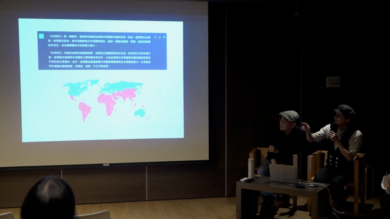 當時他就在思考,那麼台灣算不算全球南方?世界地圖上的台灣被歸類於北方.但當Documenta 15的某些藝術家一起表達「我們來自全球南方」的時候,他也不禁產生懷疑。另一方面,策展單位ruangrupa其實沒有在Documenta 15中使用這個詞,有些藝術團體也不喜歡這個標籤。「全球南方」指的到底是特定的區域、特定的意識形態,還是是一個開放的概念?這些疑問都讓仕東的世界地圖被模糊化。這場講座中,仕東從這一年來在泰卓鏈上遇到的藝術家、藝術創作,試著去呼應「全球南方」這一命題。